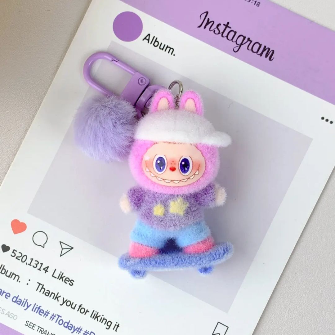 Niedlicher Labubu inspirierter Schlüsselanhänger Skateboard/lila