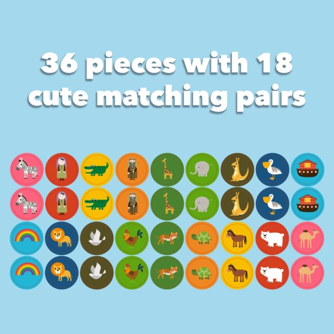 Entdecke das liebevoll gestaltete Noahs Arche Memo-Spiel – ein pädagogisch wertvolles und unterhaltsames Memory-Spiel, das speziell für Kinder ab 3 Jahren entwickelt wurde. Mit niedlichen Motiven aus der faszinierenden Geschichte der Arche Noah ist dieses Spiel der perfekte Mix aus Spaß und Lernen. Es fördert nicht nur die Konzentration und das Gedächtnis deines Kindes, sondern bringt auch die ganze Familie zusammen, um gemeinsam eine spannende Zeit zu verbringen.