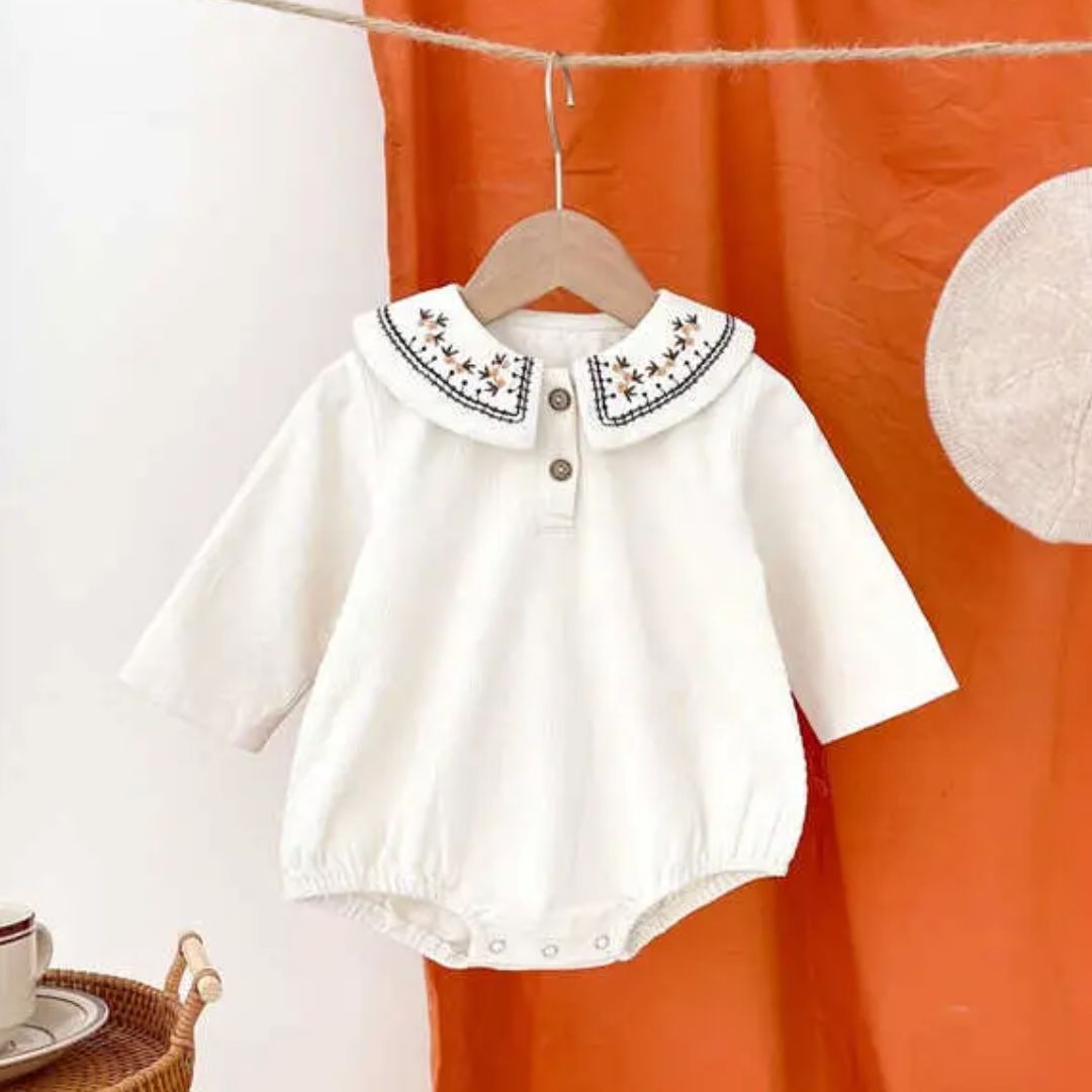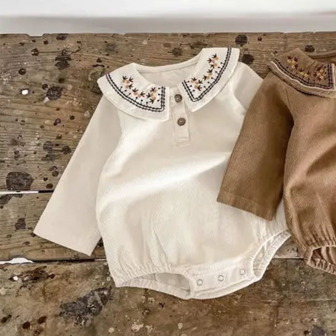 Dieser zauberhafte Baby- und Kleinkind Body aus weißem Cord mit besticktem Kragen ist zuckersüß und bequem. Der detailverliebte Overall versprüht durch sein liebevolles Design und das filigrane Blumen-Stitching viel romantischen Charme und avanciert ganz schnell zum Lieblings-Wohlfühl-Teil. Ein echter Eyecatcher an kleinen Süßlinen.