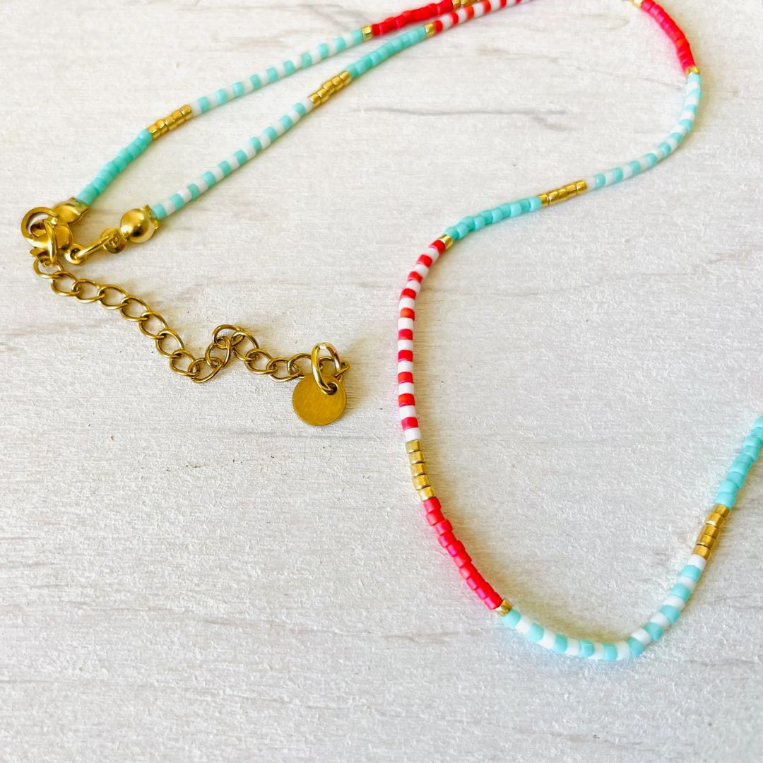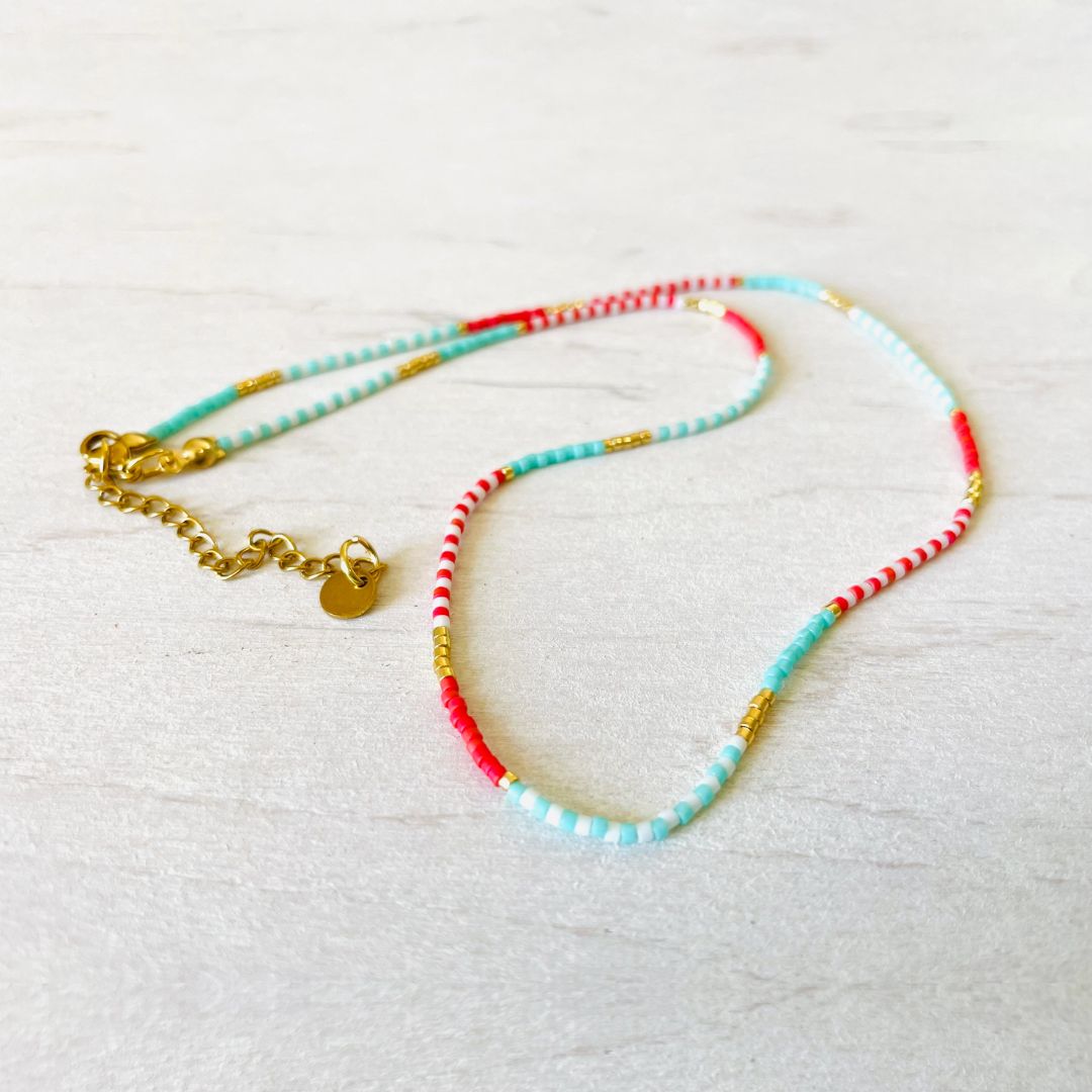 Suchbegriffe für optimale Auffindbarkeit (nicht im Shoptext sichtbar, aber SEO-relevant): Miyuki Perlen Halskette Damen, Damenkette mit bunten Perlen, Halskette rot blau gold, Perlenkette Edelstahlverschluss, Damenhalskette Miyuki rot weiß, bunte feine Damenkette, Damen Halskette Perlen modern, Rundhals Kette Damen minimalistisch, Halskette kombinierbar modern, Damenhalskette filigran rotblau.