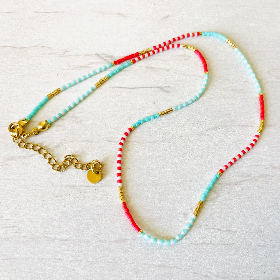 Die zarten Miyuki-Perlen mit einem Durchmesser von nur 1,6 mm sorgen für eine besonders elegante, filigrane Optik. Diese feine Verarbeitung verleiht der Halskette eine edle Wirkung, ohne aufdringlich zu sein. Gerade weil die Perlen so zart sind, kommt die Farbzusammenstellung besonders schön zur Geltung. Die harmonische Kombination aus Blau, Rot, Weiß und Gold wirkt modern, lebendig und gleichzeitig raffiniert. Die sorgfältig ausgewählten Farben bilden einen spannenden Kontrast und sorgen dafür, dass deine neue Halskette garantiert alle Blicke auf sich zieht.