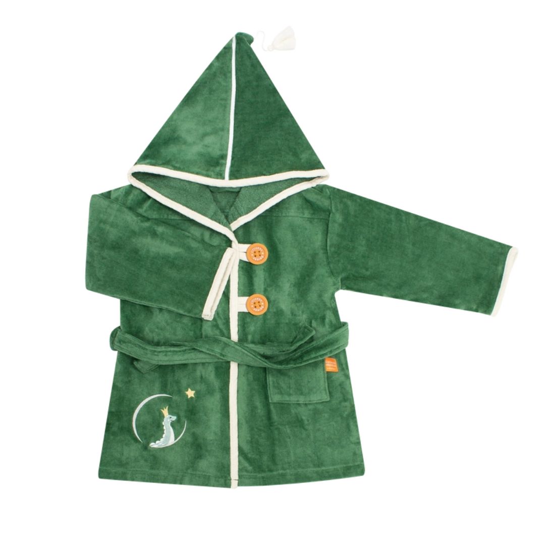 Tauche ein in ein Erlebnis voller Komfort und Gemütlichkeit mit dem zauberhaften Bademantel für Kinder im Alter von 2 bis 6 Jahren. Dieser kuschelige Bademantel in einem kräftigen Waldgrün begeistert mit einem süßen und liebevoll gestalteten Drachen-Motiv.