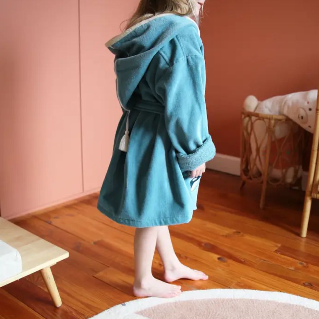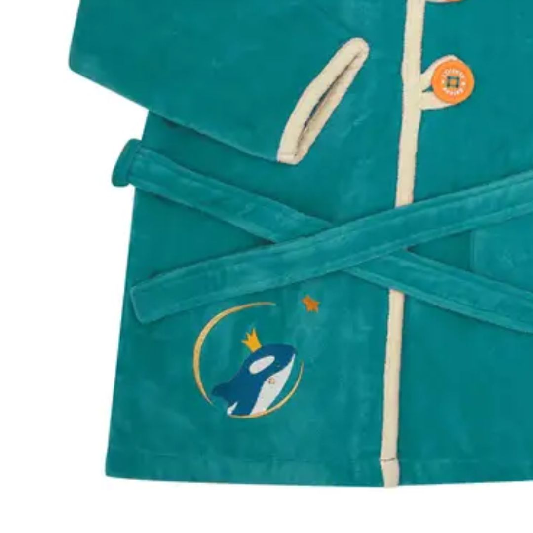 Tauche ein in ein Erlebnis voller Komfort und Gemütlichkeit mit dem zauberhaften Bademantel für Kinder im Alter von 2 bis 4 Jahren oder 4 bis 6 Jahren. Dieser kuschelige Bademantel in einem sanften Petrolton begeistert mit einem süßen und liebevoll gestalteten Orcamotiv.