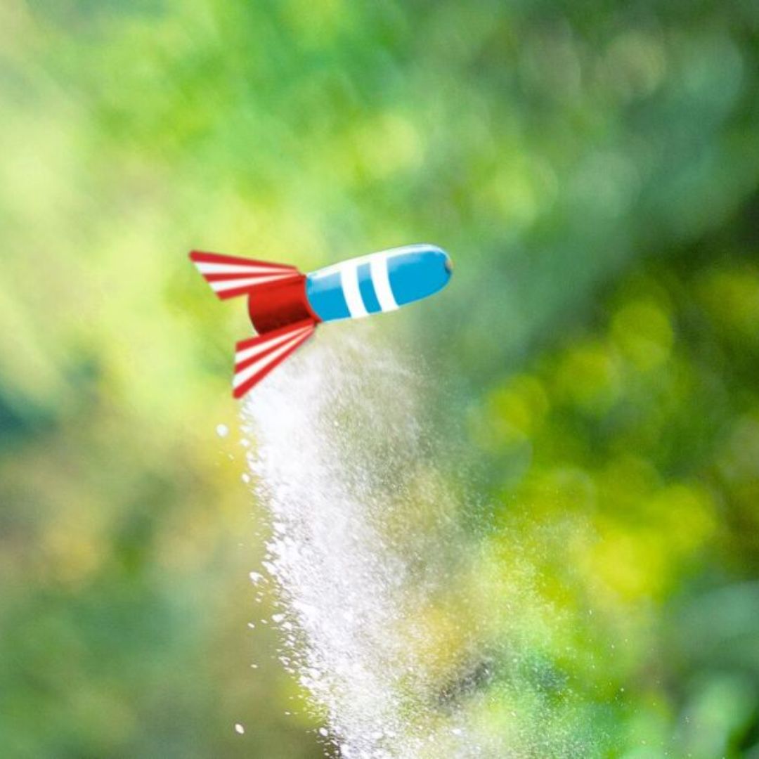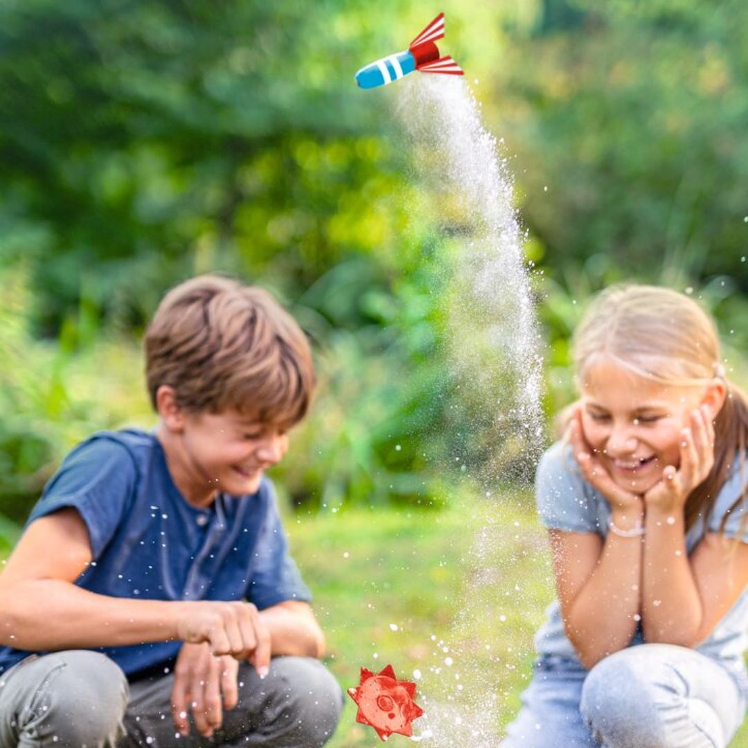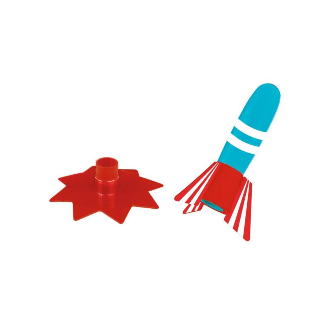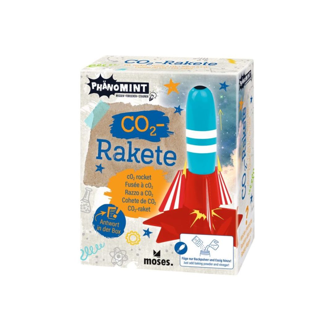 3, 2, 1... und los! Diese coole Rakete ist sofort startklar. Als Treibstoff werden nur zwei simple–– Zutaten aus der Küche benötigt, und schon schießt die Rakete von der Station: Einfach Haushaltsessig und Backpulver hinzufügen und die rotblaue Kunststoffrakete startet ihren Flug. Doch wie kann das funktionieren? Im Inneren der Verpackung wird kindgerecht erklärt, welche chemische Reaktion die Rakete fliegen lässt und welche Rolle CO₂ dabei spielt. Spielspaß und Wissensvermittlung werden hier spannend kombiniert!