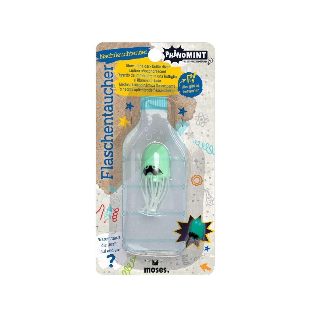 Lust auf bunten Tauchspaß? Der nachtleuchtende Flaschentaucher in Quallenform beschert Kindern spannende Anblicke im Wasser! Einfach die Qualle aus Kunststoff in eine gefüllte Wasserflasche tun, auf die Flasche drücken und schon bewegt sich der kleine Flaschentaucher durchs Wasser. Das Besondere: Dank Glow in the Dark-Effekt leuchtet die Qualle im Dunkeln und ihre Bewegungen sehen noch cooler aus. Doch warum taucht die Qualle überhaupt ab oder auf? In den beigelegten kindgerechten Erklärungen lernt man, dass die Qualle mit Luft gefüllt ist und nach oben oder unten schwimmt, da sich die Dichte der Luftblase bei Druck auf die Flasche verändert. Wissenschaft zum Beobachten und Ausprobieren also, die die Flaschentaucher-Qualle zum tollen Mitbringsel macht!