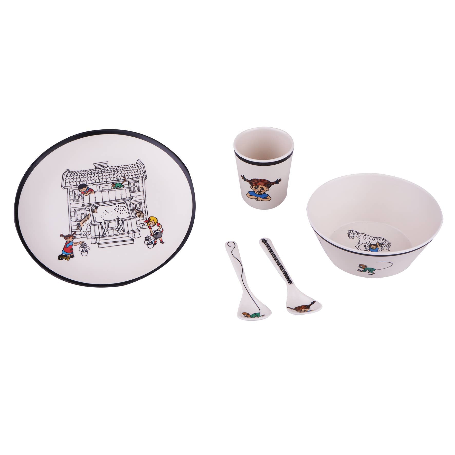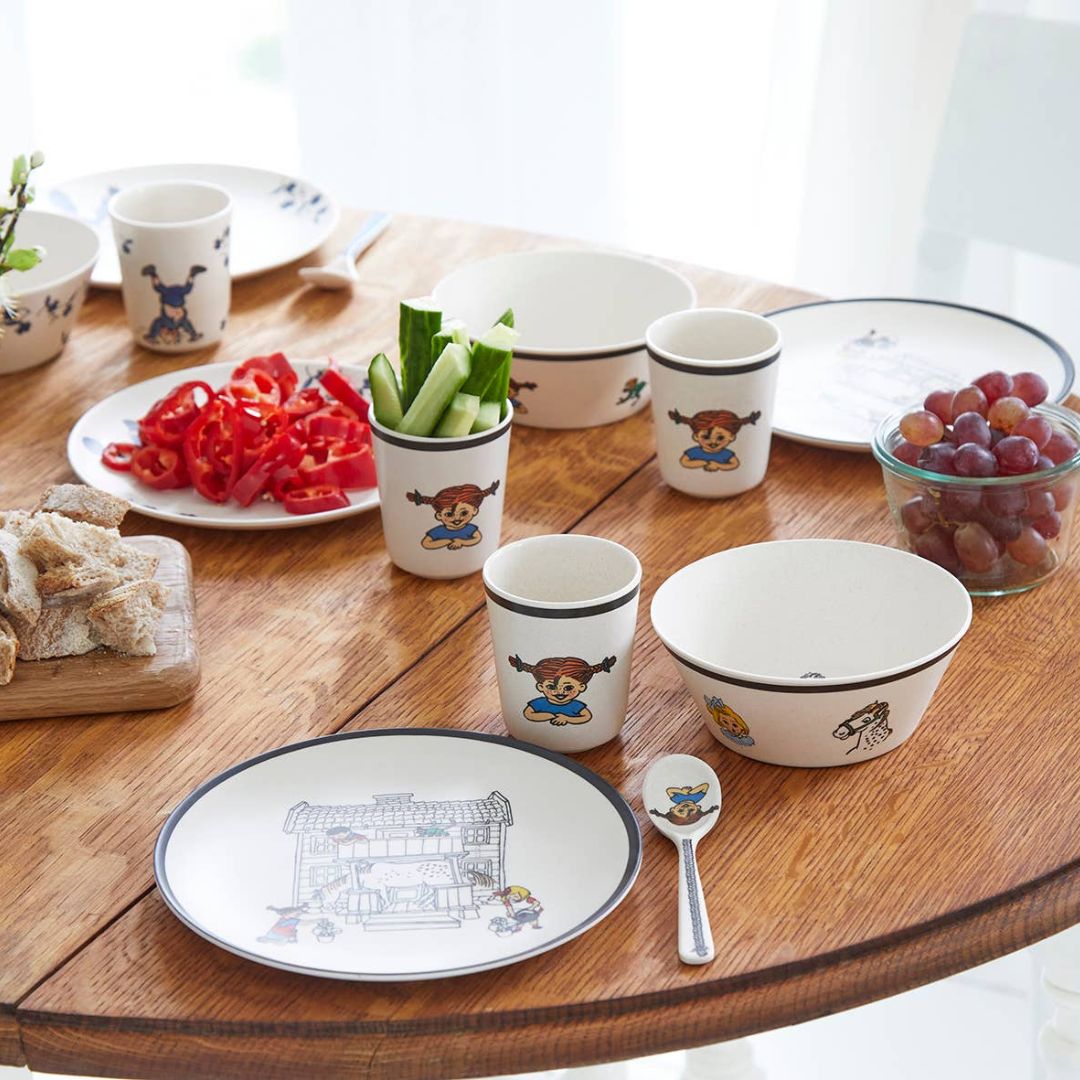 Komplette Ausstattung: Das Set enthält alles, was Kinder für ihre Mahlzeiten benötigen: eine Tasse, einen Teller, eine Schüssel und zwei Löffel. Ideal, um den Kleinen eine vollwertige Mahlzeit zu servieren und sie gleichzeitig in die Welt von Pippi Langstrumpf einzutauchen.