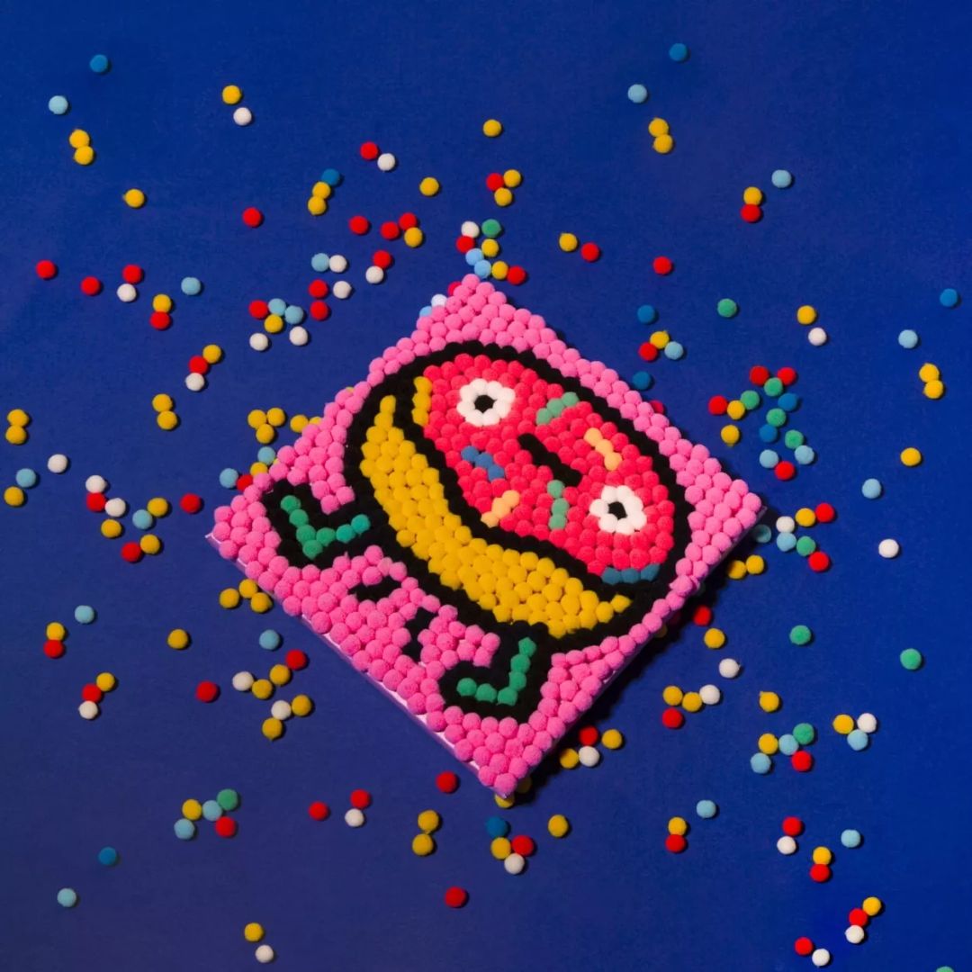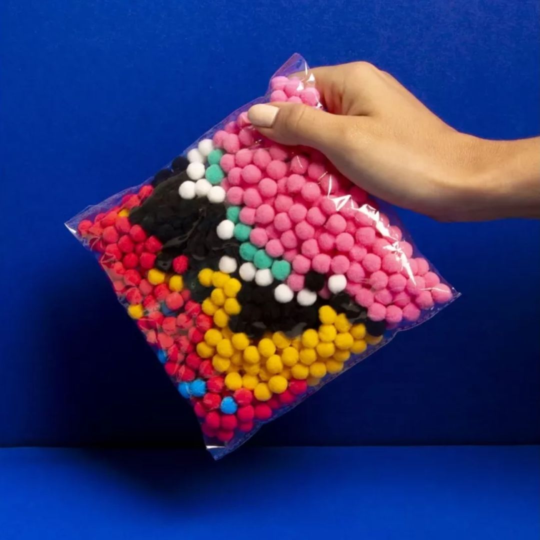 - Wähle einen der 500 Pompons aus und platziere ihn entsprechend dem Muster auf der Leinwand.