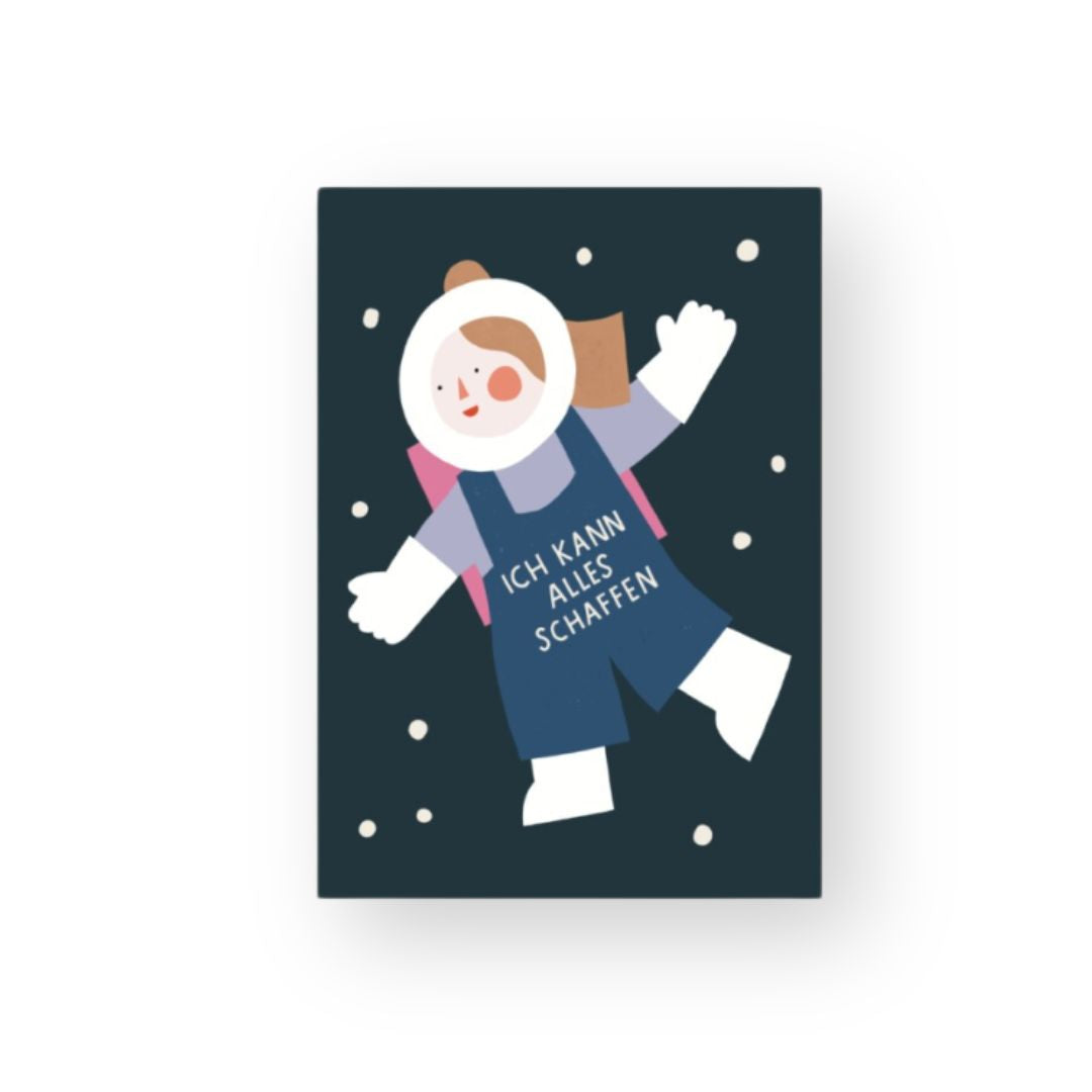 Neben ihrer Bedeutung als Mutmacher eignet sich die Karte hervorragend als Dekoration für das Kinderzimmer. Sie bringt Farbe und Leben in den Raum und sorgt gleichzeitig für eine positive Atmosphäre. Die leuchtenden Farben und die süße Darstellung der kleinen Astronautin im All machen die Karte zu einem echten Blickfang, der die Fantasie deines Kindes anregen wird.
