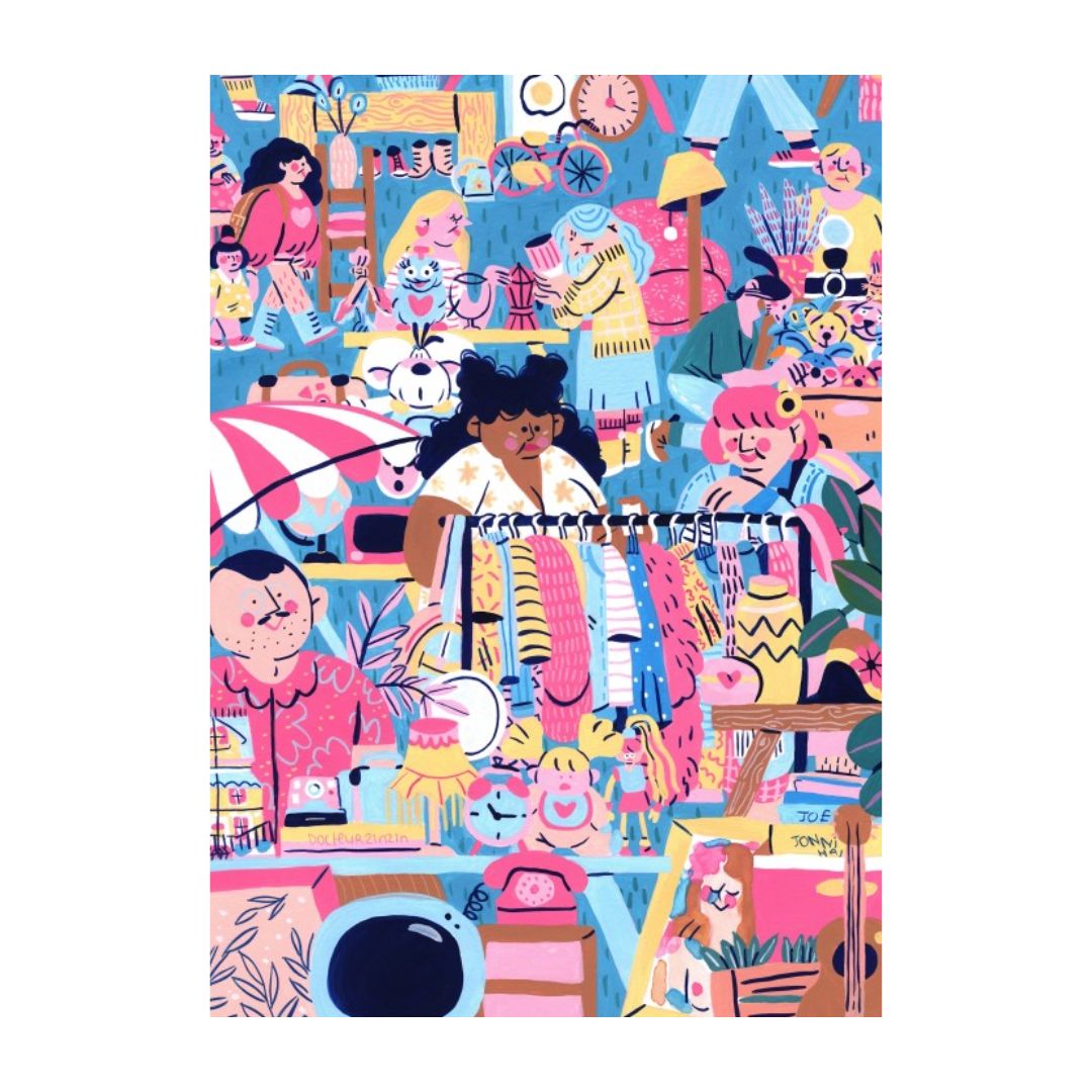 - Motiv: Lebendige Szene eines Garagen Sales mit vielfältigen Charakteren und Details, illustriert von Marie Boiseau.