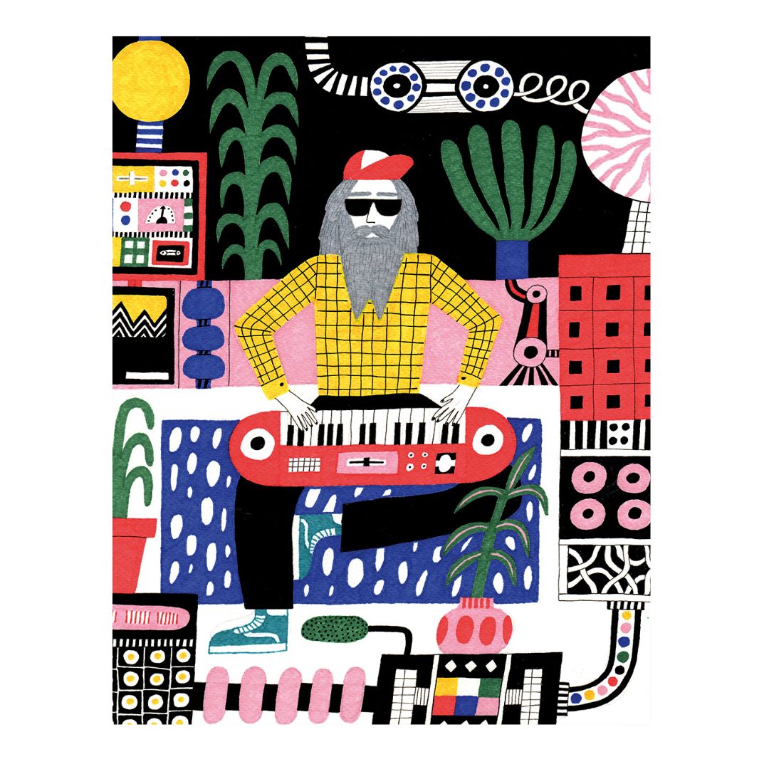 Ein Meisterwerk der Illustration: Der bärtige Musiker in Aktion
