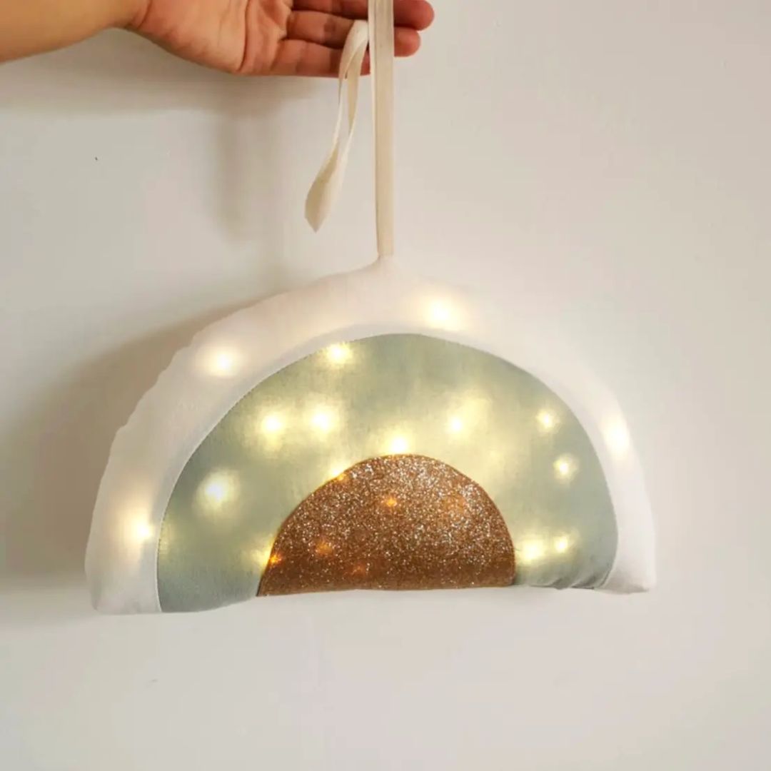 Dieses Nachtlicht ist nicht nur eine Lichtquelle, sondern auch ein Designelement. Es verbindet kindgerechte Optik mit moderner Wohnästhetik. An der Wand hängend wirkt es wie ein textiles Kunstwerk – sanft in den Farben, rund in der Form, liebevoll in den Details. Sobald Du das Licht anschaltest, wird aus der Dekoration ein stimmungsvoller Begleiter durch die Nacht. Tagsüber bleibt der Regenbogen ein charmanter Hingucker, der das Zimmer mit seiner fröhlichen und dennoch ruhigen Erscheinung verschönert.