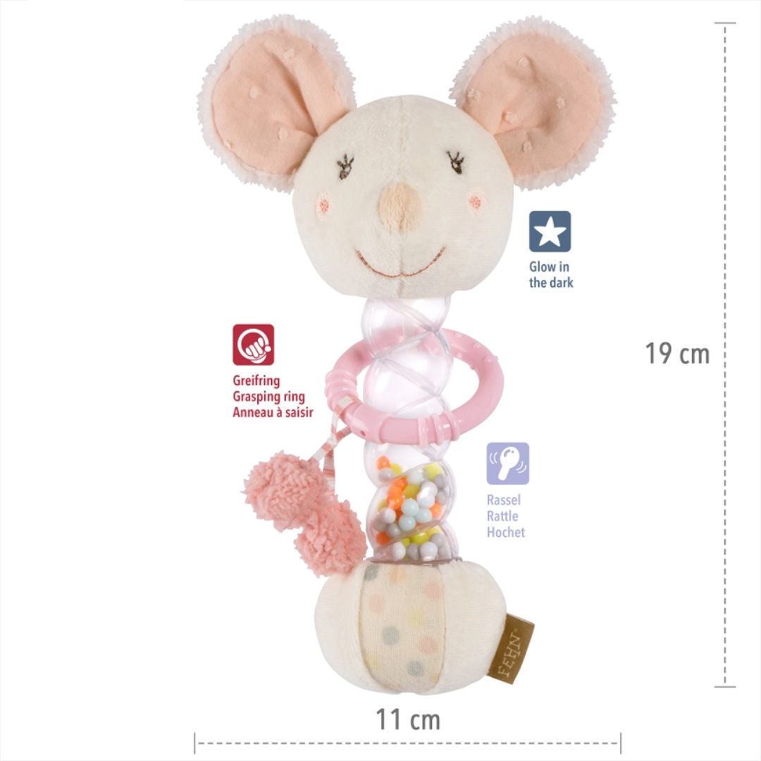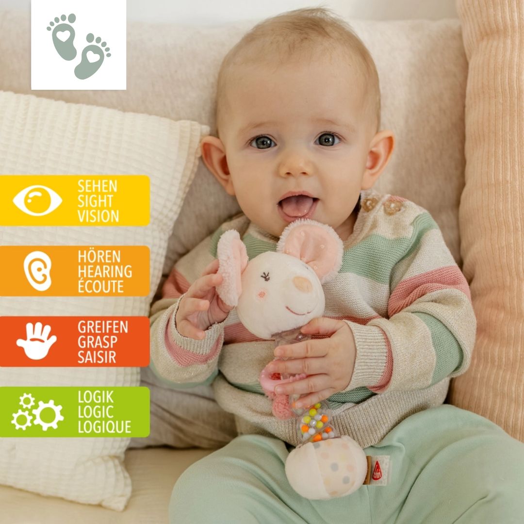 Die Form der Maus ist speziell auf kleine Hände abgestimmt. Babys können sie leicht greifen, halten und schütteln. Der Rasselstab ist nicht zu schwer und hat genau die richtige Größe, damit kleine Finger ihn mühelos umschließen können. Das macht ihn zu einem tollen ersten Spielzeug, das Babys stundenlang beschäftigt. Das ergonomische Design sorgt dafür, dass auch kleine Entdecker den Rasselstab immer wieder gerne in die Hand nehmen. Es fördert die Feinmotorik, schult den Tastsinn und hilft dabei, die Hand-Augen-Koordination zu verbessern.