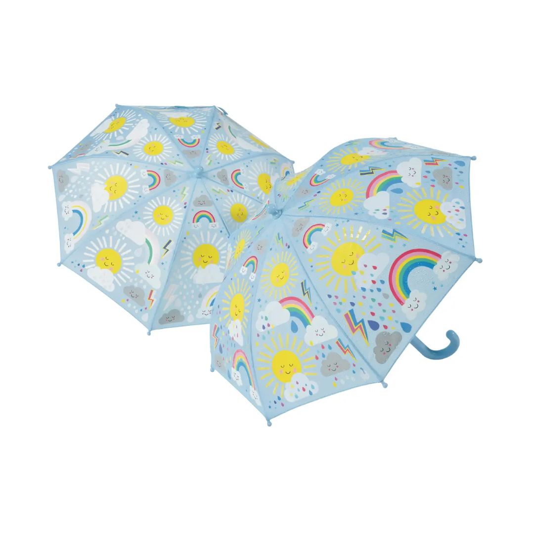 Sobald der erste Regentropfen fällt, beginnt die Magie: Die süßen Sonnen, Wolken, Regenbögen und Tropfen auf dem Schirm verändern ihre Farbe und zeigen sich von ihrer kunterbunten Seite. Das sorgt für leuchtende Augen und echte Begeisterung – denn dein Kind kann live miterleben, wie sich der Schirm verwandelt.