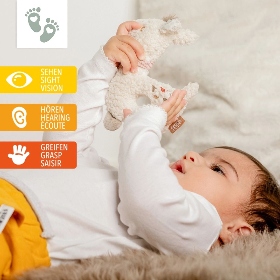 Der Ring-Greifling Lama ist speziell dafür entwickelt, die Sinne deines Babys zu stimulieren und seine motorischen Fähigkeiten zu fördern. Die weichen Materialien und die verschiedenen Oberflächenstrukturen animieren dein Baby zum Fühlen und Entdecken. Das integrierte Rasselgeräusch weckt Neugier und lädt dazu ein, den Greifling immer wieder zu bewegen und zu schütteln – so wird der Hörsinn spielerisch trainiert. Babys lernen durch das Greifen und Tasten die Welt um sich herum kennen, und der Ring-Greifling Lama ist der perfekte Begleiter auf dieser Entdeckungsreise.