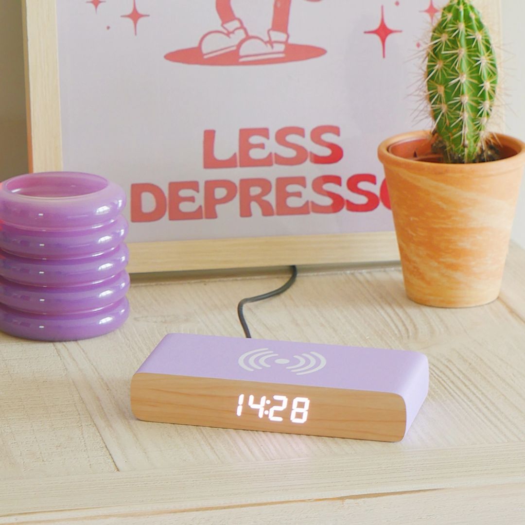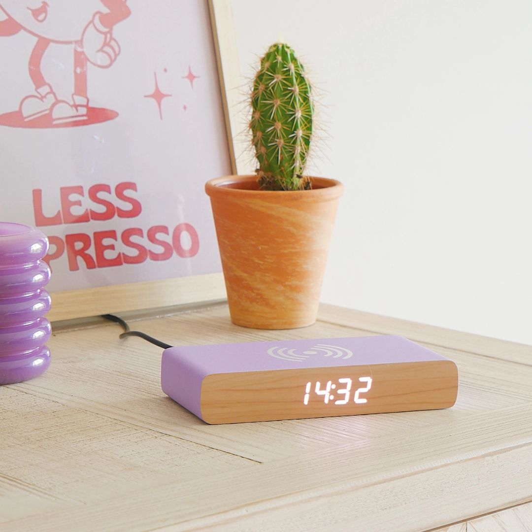 Kabelloses Ladegerät und Wecker 'Rise Charge' in Lila – Dein smarter Begleiter für den perfekten Start in den Tag