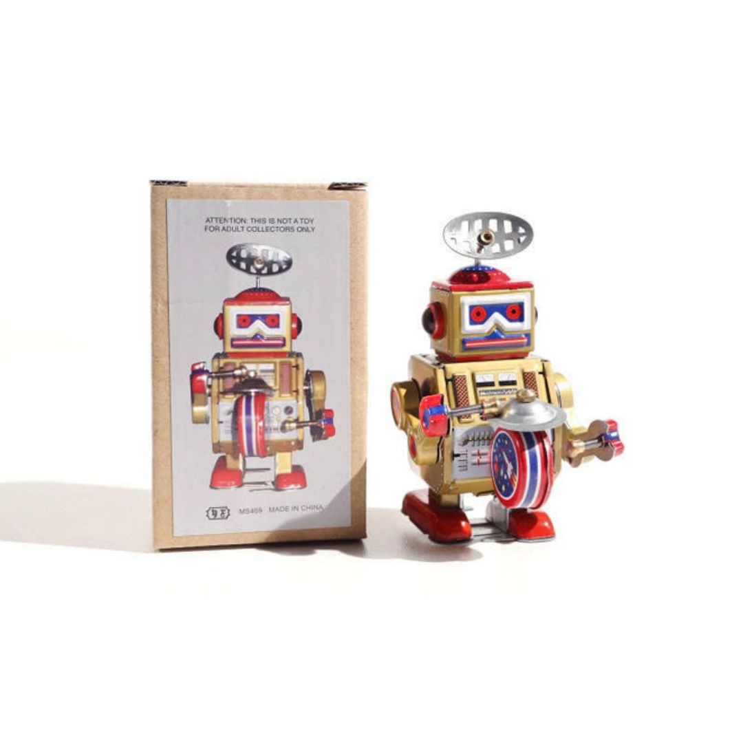 Tauche ein in die faszinierende Welt der mechanischen Blechspielzeuge mit dem Roboter "Bigband"! Dieses charmante, nostalgische Aufziehspielzeug begeistert Jung und Alt gleichermaßen und versprüht den Charme vergangener Zeiten. Der kleine, goldene Roboter ist nicht nur ein faszinierendes Sammlerstück, sondern sorgt auch für jede Menge Spielspaß. Sobald du das Aufziehwerk mit dem mitgelieferten Schlüssel aktivierst, beginnt der Roboter sich zu bewegen, schlägt mit seinen Trommelstöcken auf die Trommel und das Becken und bringt so Musik in dein Zuhause.