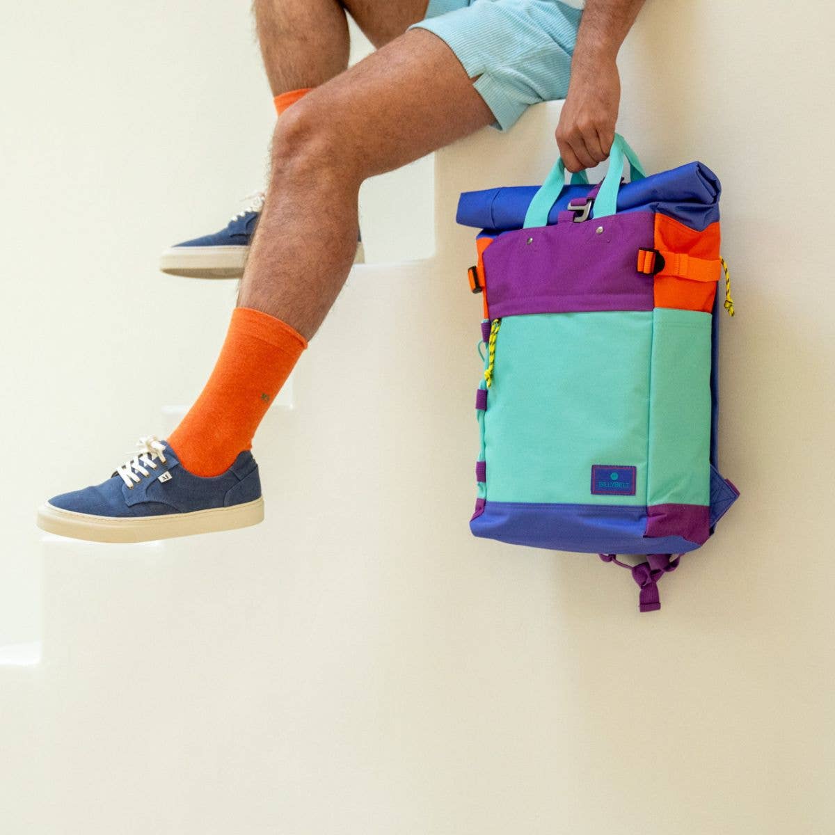 Mit diesem Rolltop-Rucksack entscheidest du dich nicht nur für ein stylisches Accessoire, sondern auch für ein umweltbewusstes Produkt, das Funktionalität und Design perfekt miteinander verbindet. Die mehrfarbige Kombination aus Türkis, Lila und Orange macht ihn zu einem echten Eyecatcher, der deine Persönlichkeit und deinen Sinn für Stil unterstreicht.