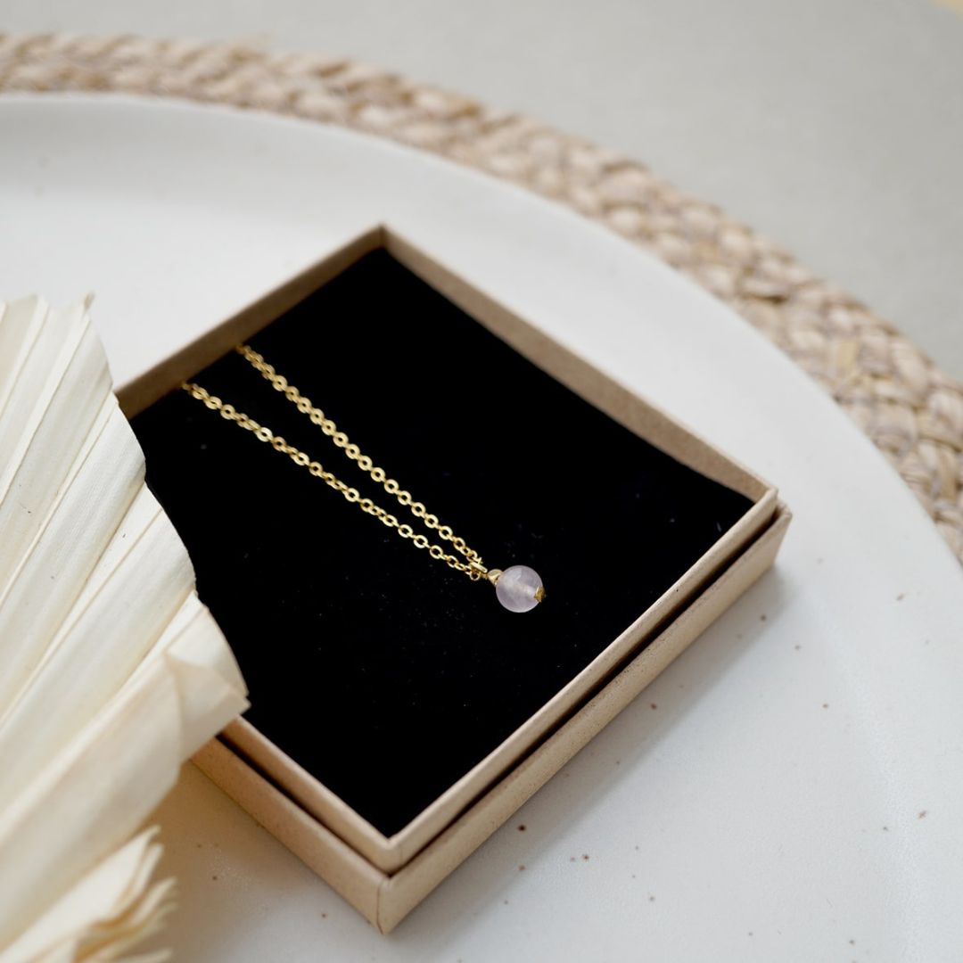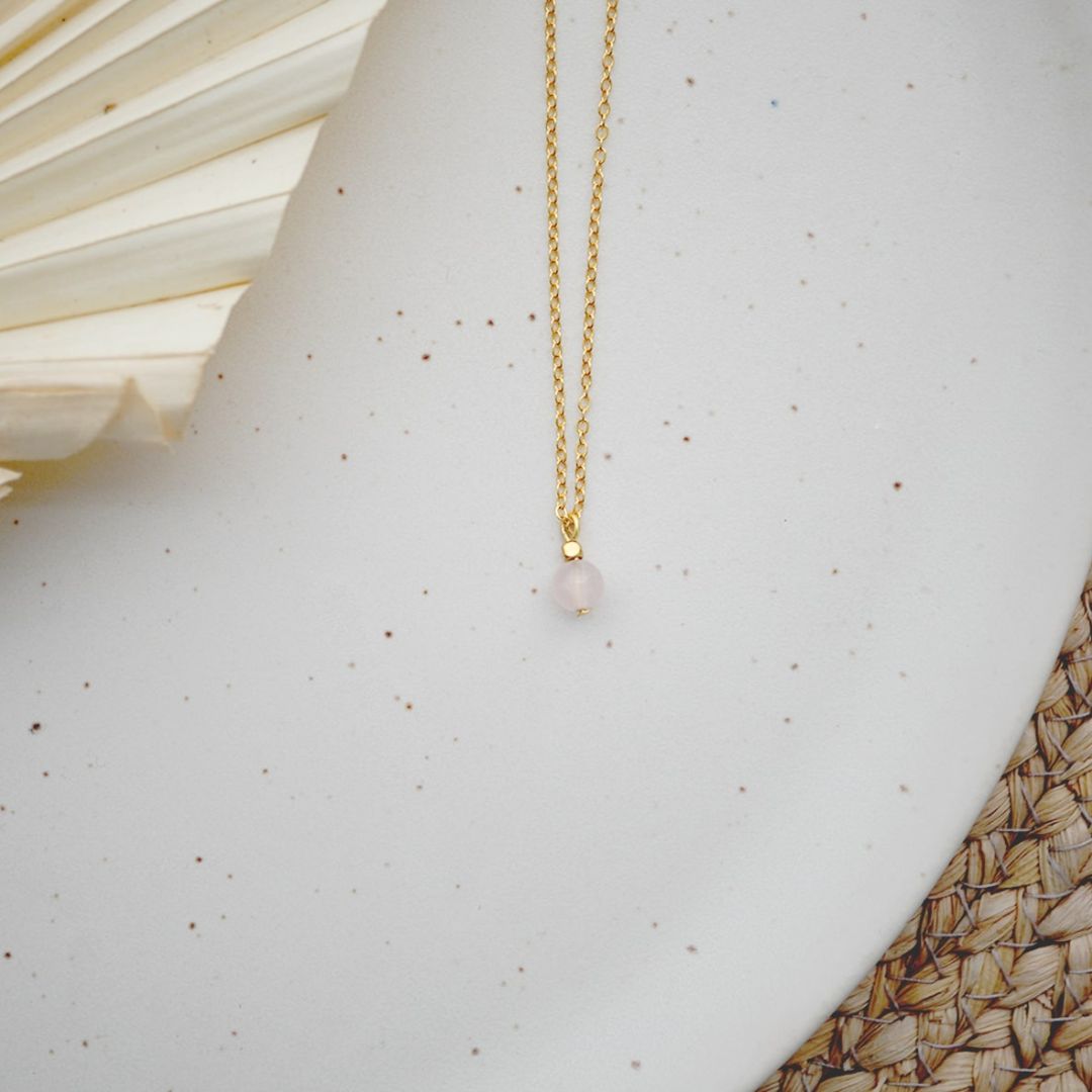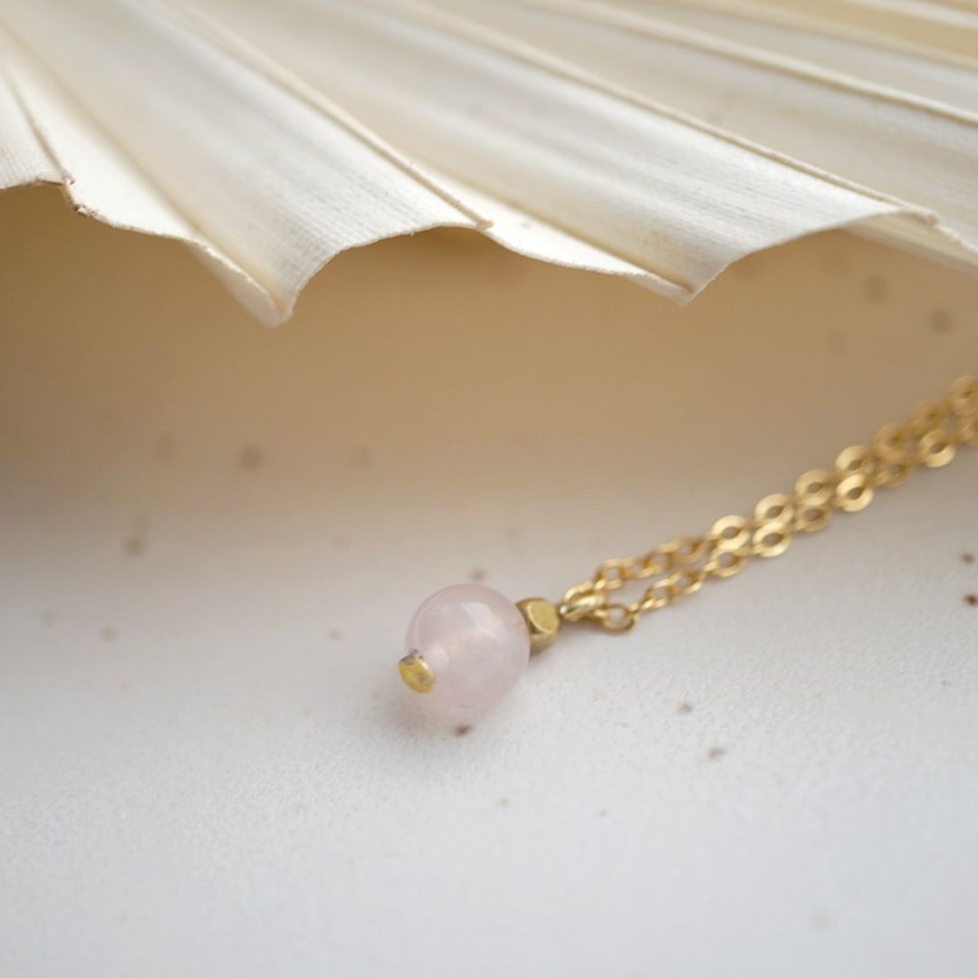 Fein und zart ist diese wunderschöne Halskette. Ein eleganter Rosenquarz schmückt dich dezent. Die Gliederkette ist 45 cm lang, Messing vergoldet. Halbedelstein & Messing, nickel- & bleifrei synthetische Kordel