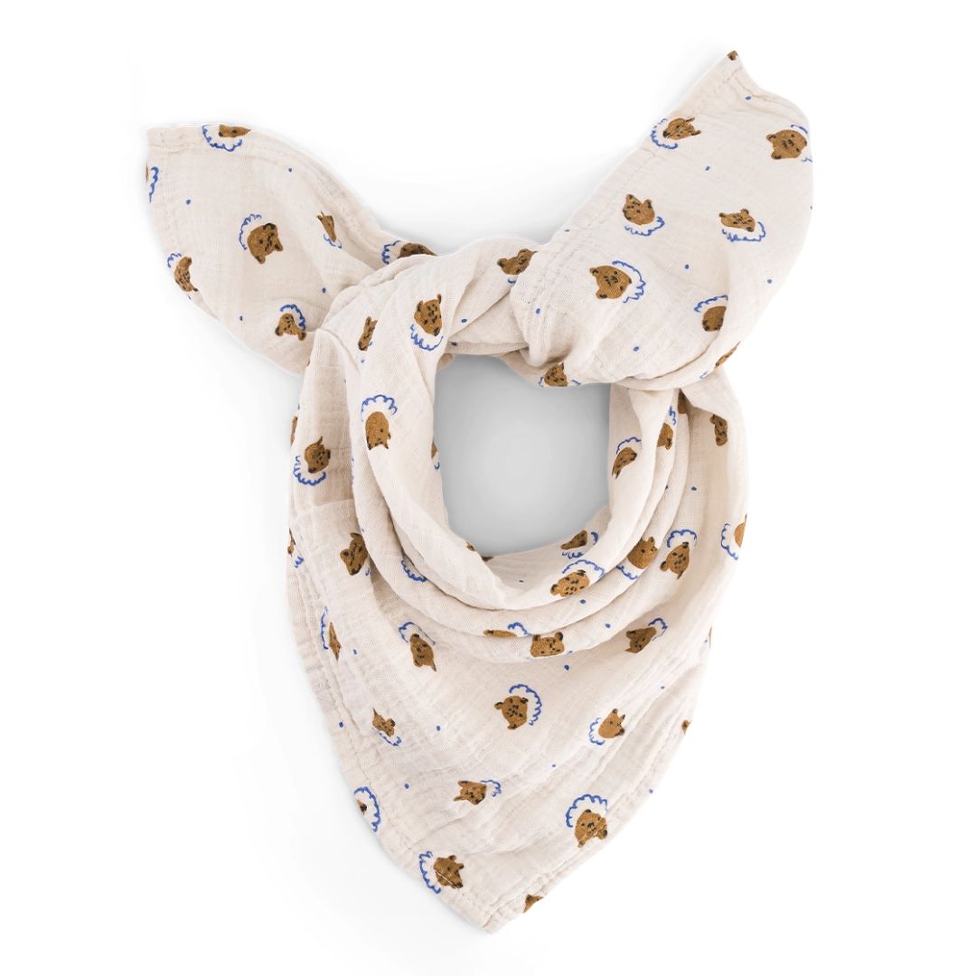 Der Baumwollmusselin sorgt dafür, dass sich das Tuch angenehm tragen lässt und auch bei längerem Gebrauch seine Form behält. Die feine Struktur verleiht dem Musselintuch einen natürlichen Look, der perfekt zum sanften Teddy-Muster passt.