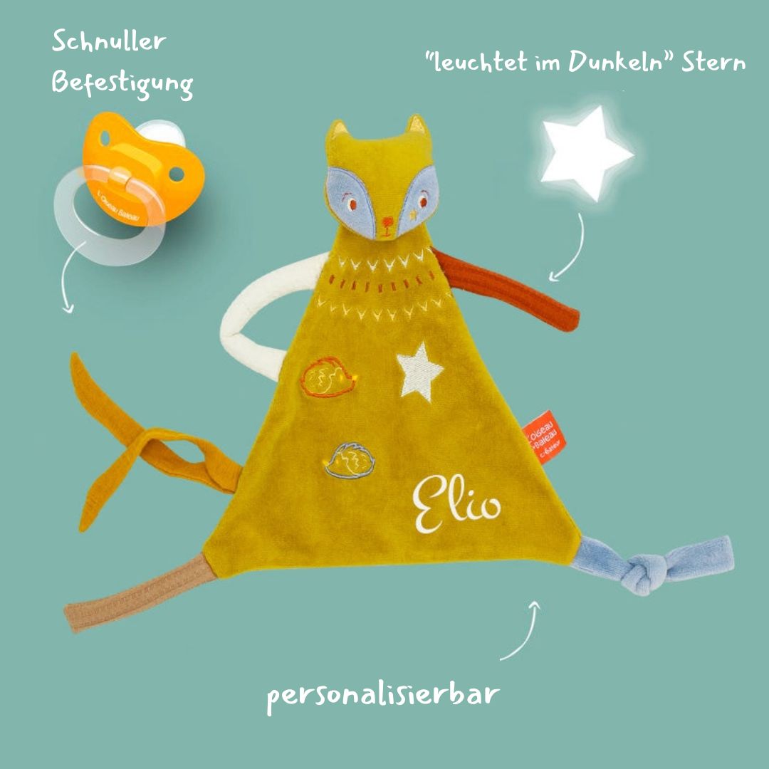 Ein personalisierbares Schmusetuch senfgelber Fuchs für süße Träume!