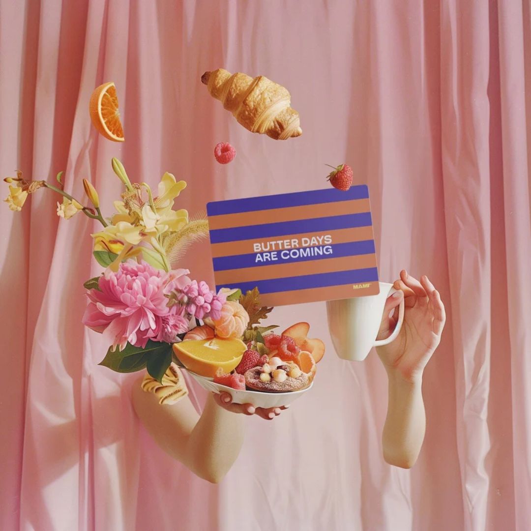 Positive Ansage für graue Morgen: Butter Days Are Coming. Farbenfrohes Streifendesign für streichzarten Optimismus mit ordentlich Fettgehalt. Häppy MAMF!
