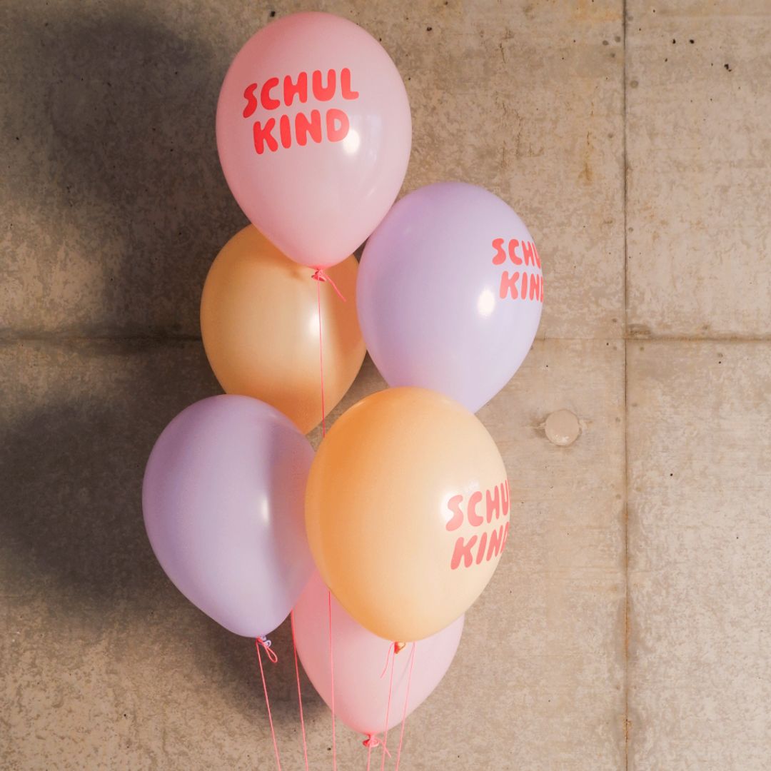 Inhalt: 6 Ballons (3 bedruckt mit „Schulkind“, 3 unbedruckt)