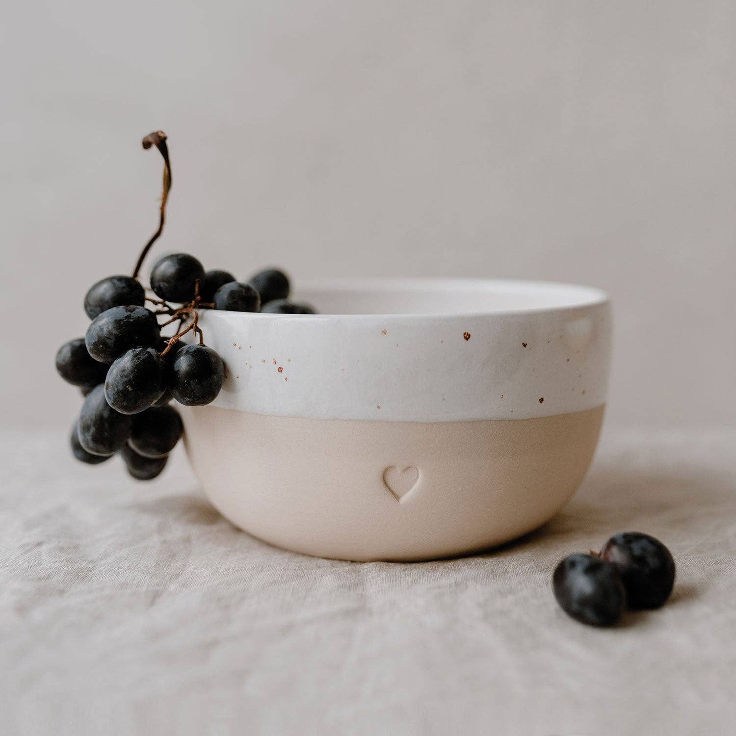 Endlich können wir euch unsere neuen Schüsseln aus Steingut zeigen, wie die Schüssel Herz 15cm. In dieser süßen Schüssel steckt sehr viel Herzblut. Eine kleine Töpferei aus Portugal produziert diese wundervolle Schüssel in liebevoller Handarbeit & ist ein großartiger neuer Begleiter in deinem Alltag und für Me-Time Momente. Diese hübsche  Schüssel läßt die Herzen höher schlagen, die die Individualität von Ton & Glasur lieben, denn jede einzelne Schüssel hat seinen ganz eigenen Touch. Das minimalistische Design und die natürlichen Farbnuancen werden von der welligen Form abgerundet. Das Highlight der Schüssel ist die Blindprägung in Form eines Herzens. Wir sind verliebt, voller purer Freude & können es kaum abwarten unsere neue Schüssel Herz 15cm in euren Händen zu sehen! Merkmale: Schüssel mit Blindprägung Spülmaschinenfest Material: Steingut Pflegehinweis: Spülmaschinenfest Maße Höhe: ca. 8,5 cm Durchmesser: ca. 15 cm