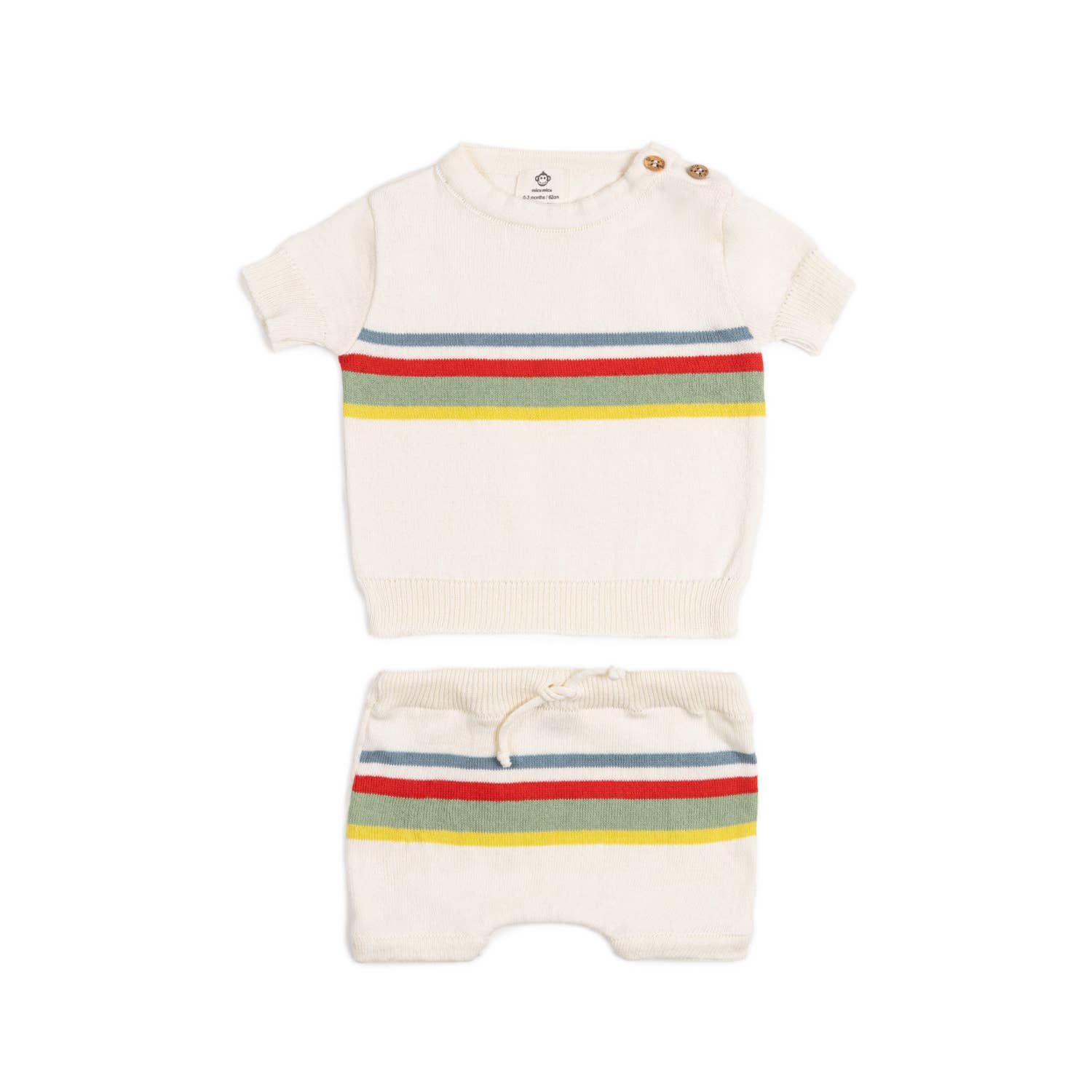 Dieses Set ist ideal für die warmen Monate, da die Bio-Baumwolle leicht und atmungsaktiv ist. Es eignet sich hervorragend für den Alltag, Ausflüge oder besondere Anlässe, da es sowohl praktisch als auch schick ist. Die durchdachten Designdetails, wie die Knöpfe an der Schulter des T-Shirts und der elastische Bund mit Kordelzug an den Shorts, bieten zusätzlichen Komfort und erleichtern das Ankleiden. Das süße Ecru-Design mit Kontraststreifen sorgt dafür, dass dein Baby immer stilvoll und komfortabel gekleidet ist.
