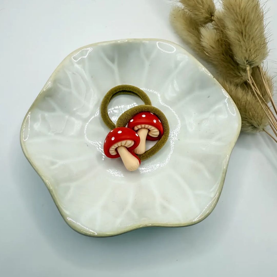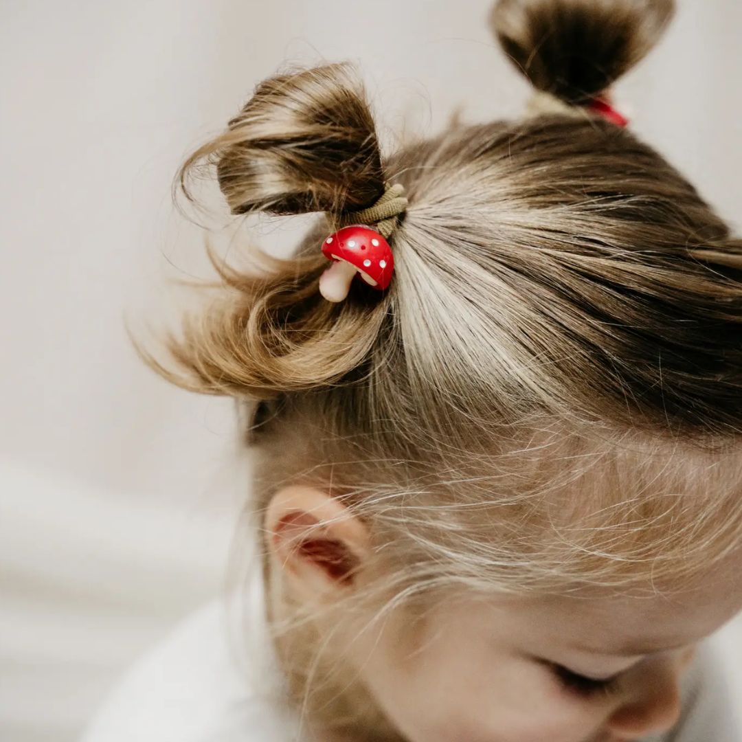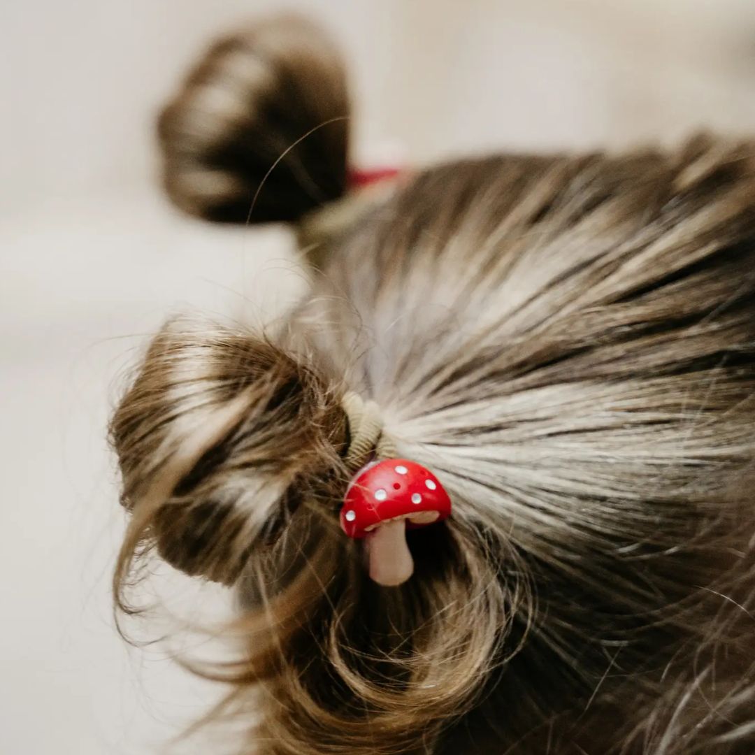 Feine, weiche Haargummis mit niedlichen Pilzen daran. Immer einfach zu verwenden für z.B. Zöpfe und einen Pferdeschwanz. Set von 2.
