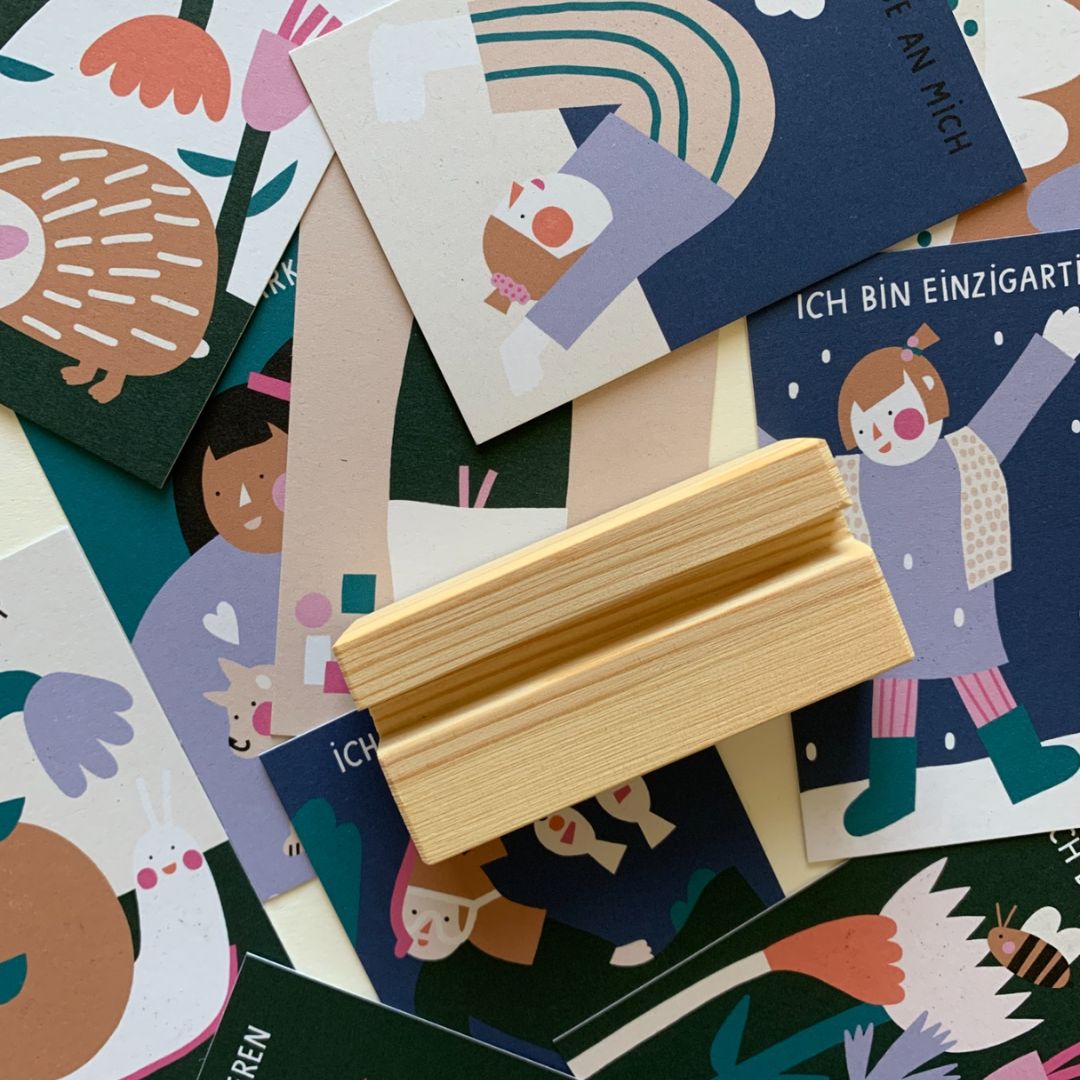 Doch das ist nicht alles! Die hochwertigen Karten werden auf festem Recyclingpapier mit einer angenehmen Struktur gedruckt und sind somit nicht nur wunderschön, sondern auch umweltfreundlich. Ergänzt wird das Set durch einen handgefertigten Kartenhalter aus recyceltem Holz, in dem alle Karten Platz finden.