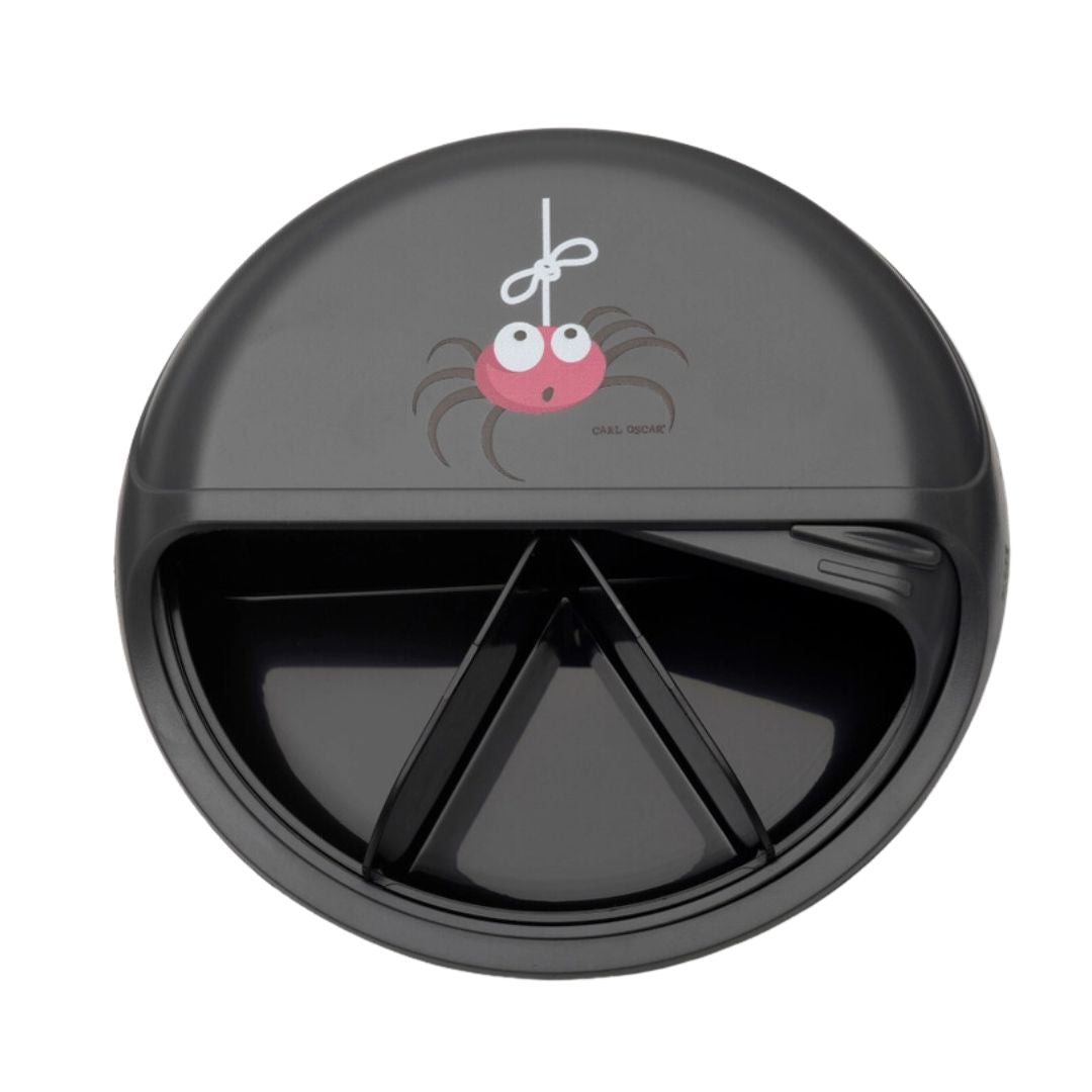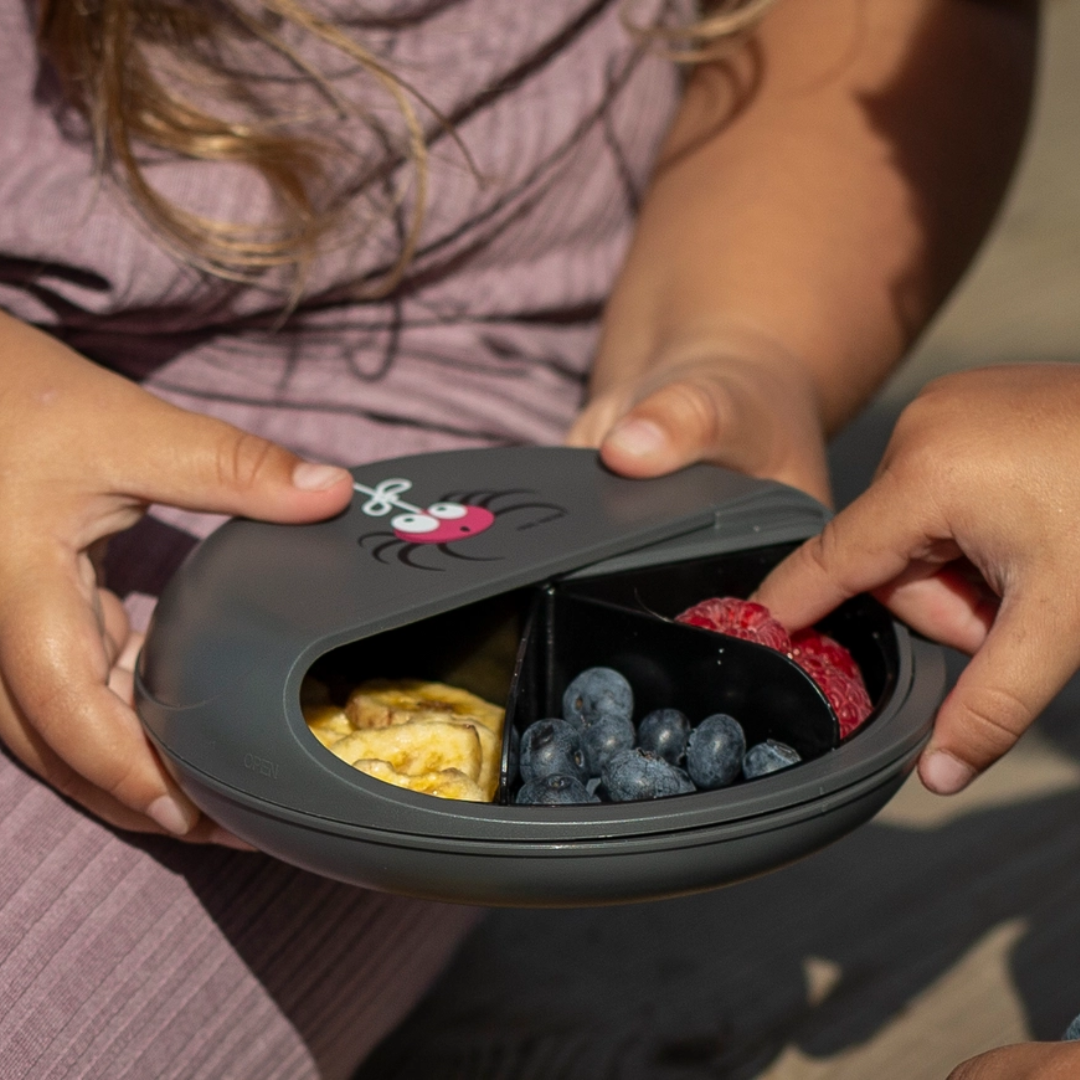 Die SnackDisc - Farbe: Anthrazit - Design: Spinne ist die perfekte Lösung für alle Eltern, die ihren Kindern gesunde Snacks bieten und gleichzeitig umweltbewusst handeln möchten. Mit ihrem einzigartigen Design, den praktischen Features und der einfachen Handhabung ist sie ein unverzichtbarer Begleiter für jede Familie. Hol dir jetzt die SnackDisc und erlebe, wie einfach und unterhaltsam gesunde Ernährung sein kann!