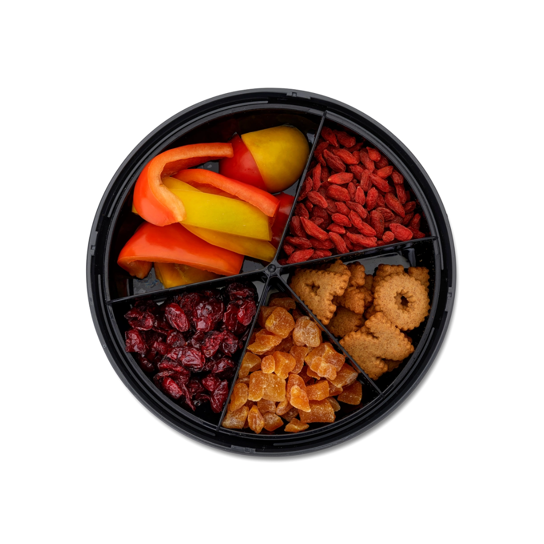 - Praktisch: Fünf drehbare Fächer für verschiedene Snacks, die frisch und unzerdrückt bleiben.