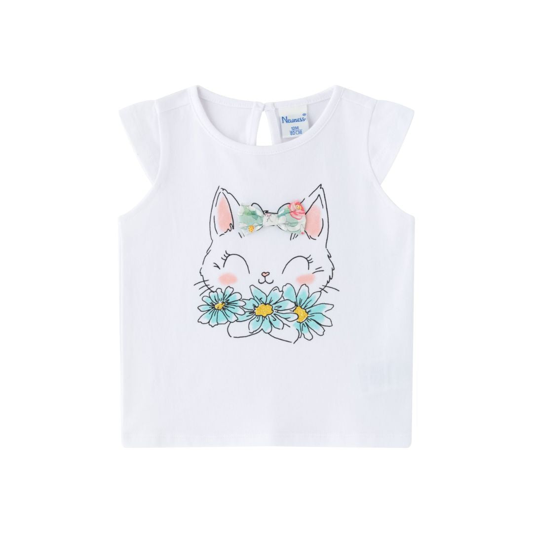 Baumwoll-T-Shirt für Mädchen mit kurzen Ärmeln, die die Schulter bedecken. Wasserbasierter Druck mit Stoffschleifenapplikation und Katzenprint.