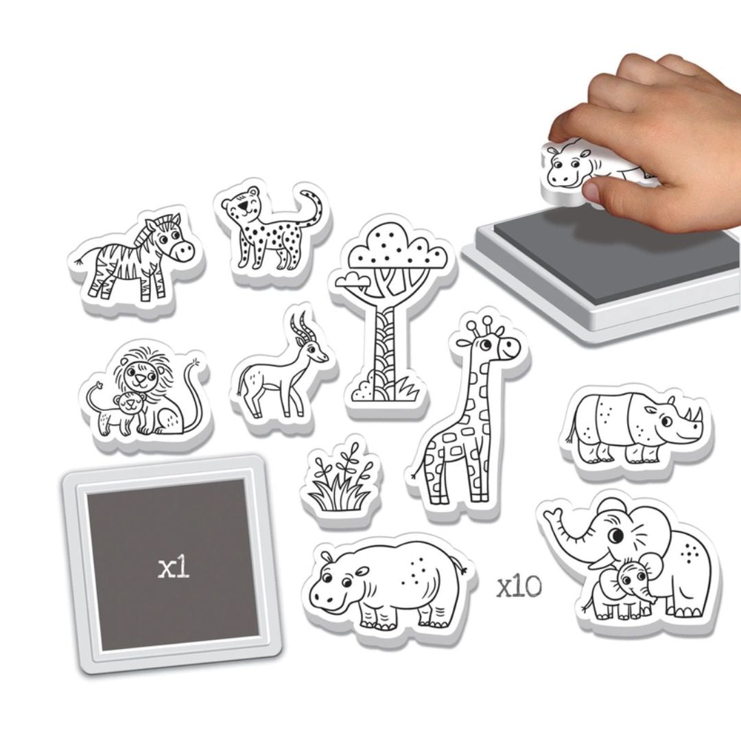 Das Stempelset „Meine kleine Savanne“ enthält eine Auswahl an bezaubernden Savannen-Tieren, die es deinem Kind ermöglichen, eine lebendige und realistische Savannenlandschaft zu gestalten. Die enthaltenen Figuren umfassen: