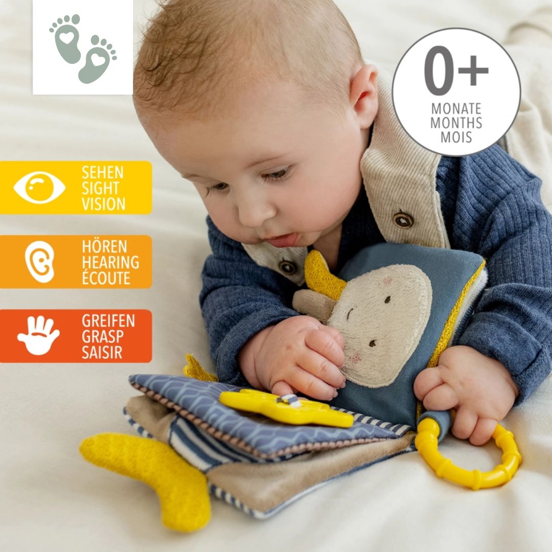 Verschiedene Materialien: Das Buch bietet eine Vielzahl an aufregenden Texturen – von kuscheligem Plüsch über weichen Musselin bis hin zu griffigem Frottee. Diese Vielfalt lädt dein Baby zum Fühlen, Tasten und Entdecken ein.