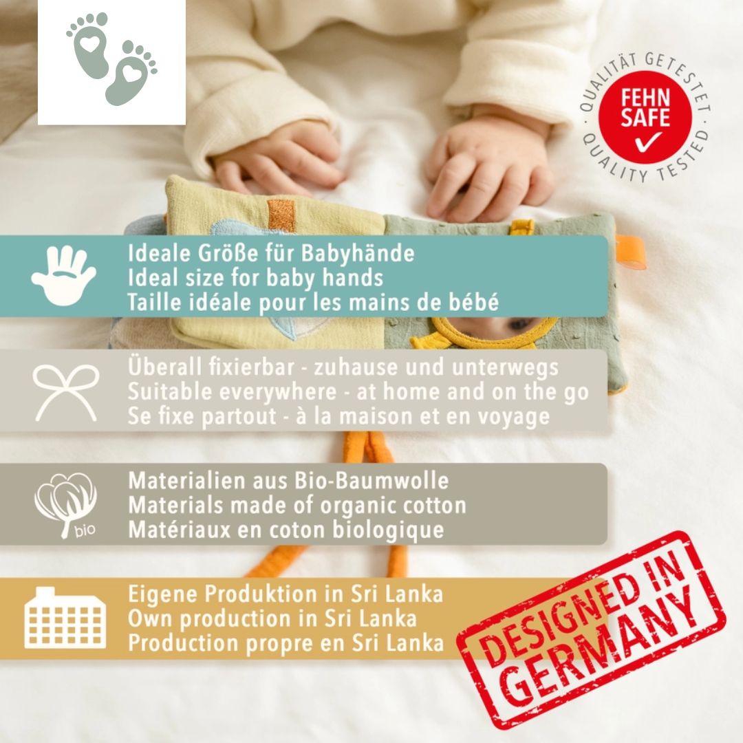 Das Stoffbuch Schaf ist nicht nur perfekt für die Krabbeldecke oder das Kinderzimmer, sondern auch ein idealer Begleiter für unterwegs. Egal, ob im Auto, beim Spaziergang im Kinderwagen oder beim Besuch bei Freunden – dieses Fühlbuch sorgt immer für Spaß und Beschäftigung. Es ist leicht und kompakt, sodass es problemlos in jede Wickeltasche passt. So kannst du sicherstellen, dass dein Kind jederzeit ein spannendes Spielzeug hat, das es zum Spielen anregt.