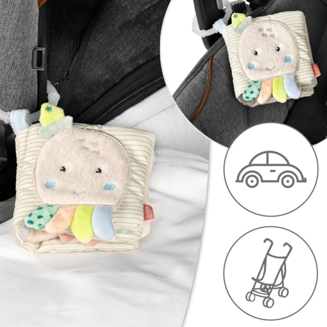 Das Stoffbuch Oktopus ist nicht nur für zuhause geeignet, sondern auch ein idealer Begleiter für unterwegs. Dank des praktischen Befestigungsrings kannst du es problemlos an deinem Kinderwagen, der Babyschale oder im Auto befestigen. So ist es immer griffbereit und sorgt dafür, dass dein Baby auch auf Reisen unterhalten wird. Egal, ob im Wartezimmer, beim Einkaufen oder auf langen Autofahrten – das Stoffbuch wird schnell zum besten Freund deines kleinen Entdeckers.