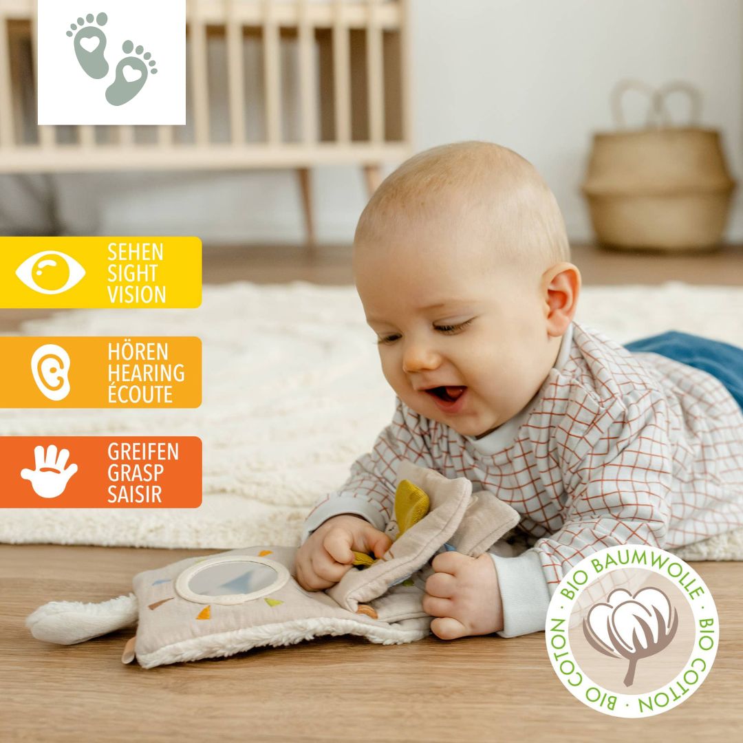 Die verschiedenen Strukturen der einzelnen Seiten – ob weicher Plüsch, zarter Musselin, kuscheliger Nicki oder robuster Cord – sorgen für ein taktiles Abenteuer. Dein Kind wird es lieben, die unterschiedlichen Materialien zu ertasten und zu erforschen. Diese Vielfalt an Texturen fördert nicht nur die sensorische Wahrnehmung, sondern trägt auch zur Entwicklung der Hand-Auge-Koordination bei. Indem dein Baby die Seiten umblättert und die verschiedenen Materialien anfasst, schult es seine motorischen Fähigkeiten.