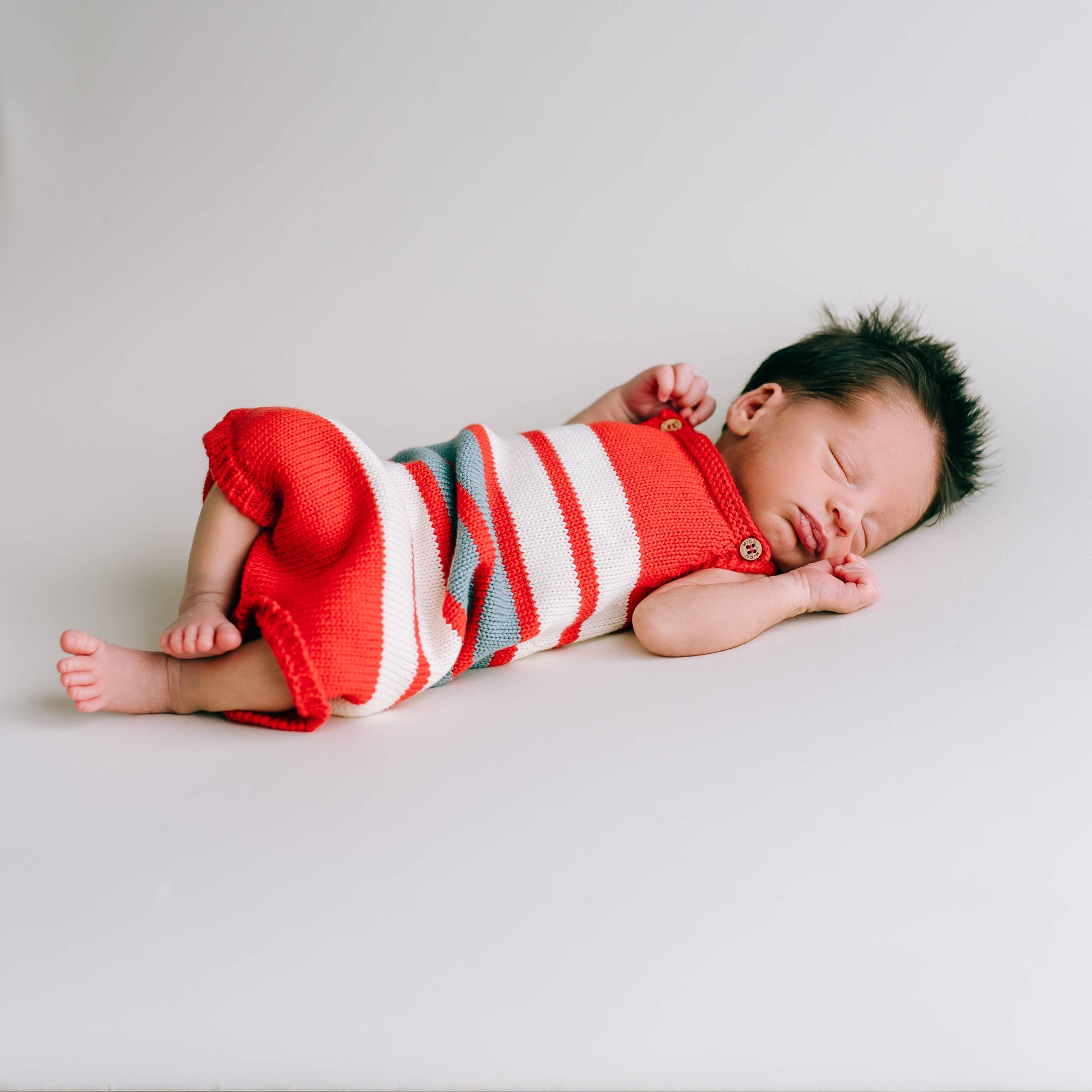 Unser Babystrampler in Ecru mit leuchtenden Korallenrot-Streifen wird aus hochwertiger Bio-Baumwolle in Spanien gefertigt. Dieser bequeme  Strampler ist ein echter Blickfang und eignet sich ideal für dein Baby. Er verfügt über charmante Knöpfe aus natürlichem Olivenholz an den Schultern und Schritten. Vielseitig kombinierbar, passt er perfekt zu einem Hemd oder einem feinen Jersey darunter.