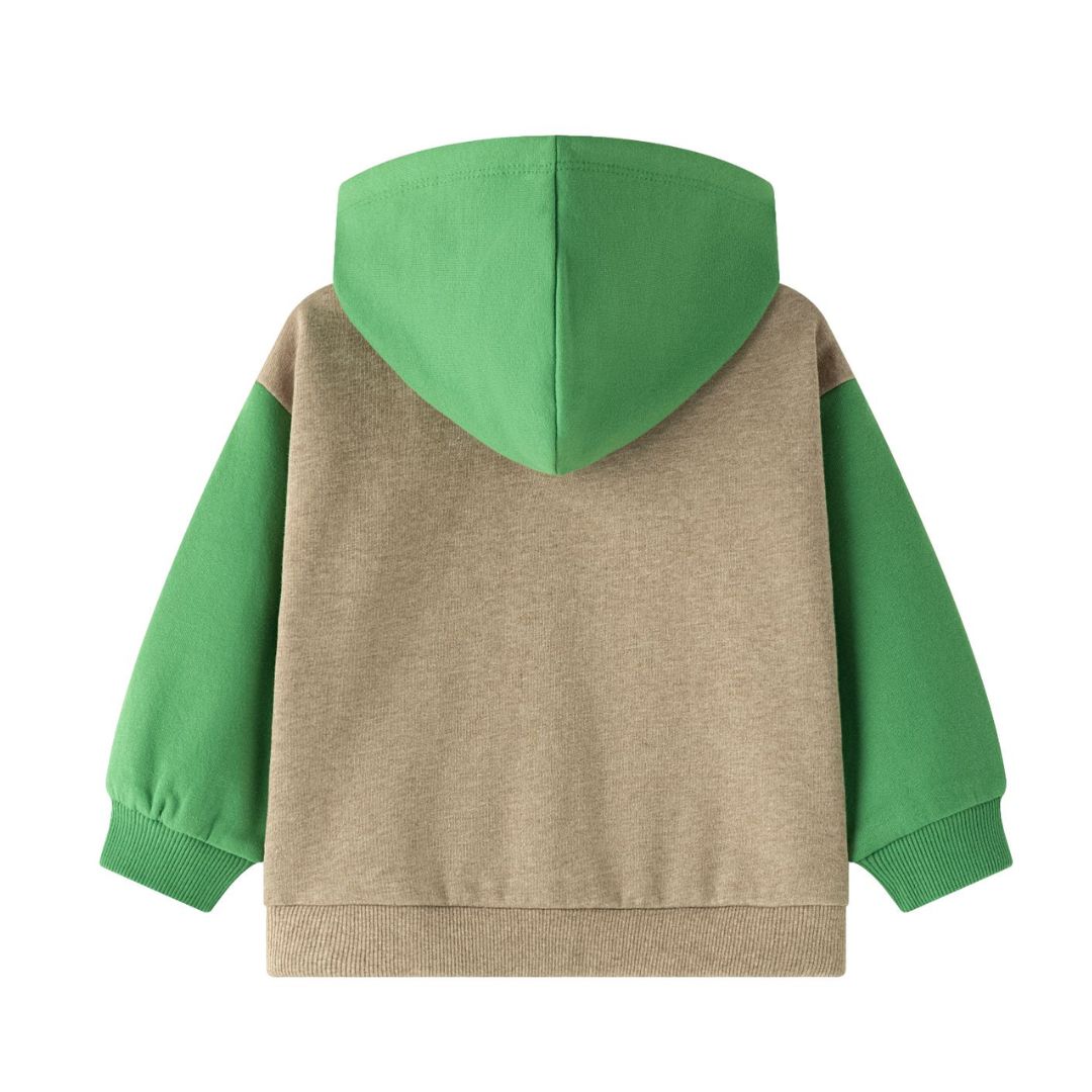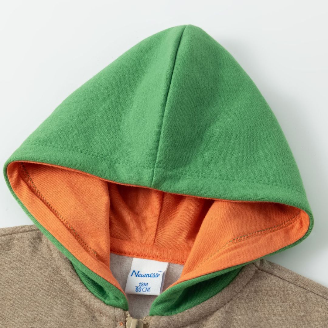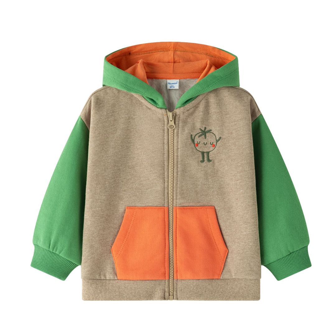 Offener Baby-Sweatshirt für Jungen mit Reißverschluss und Kapuze. Aufgerauter Fleece. Kapuze, Ärmel und Tasche in Kontrastfarbe. Gesticktes Tomatenmotiv auf der Brust.