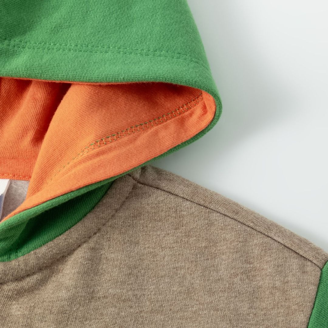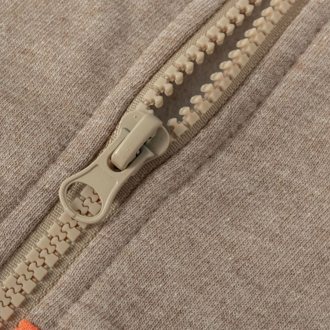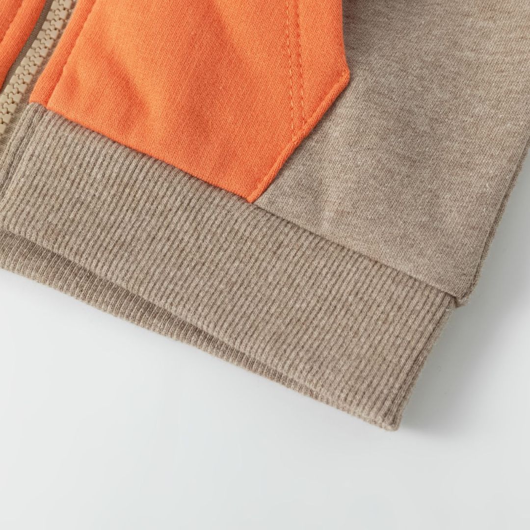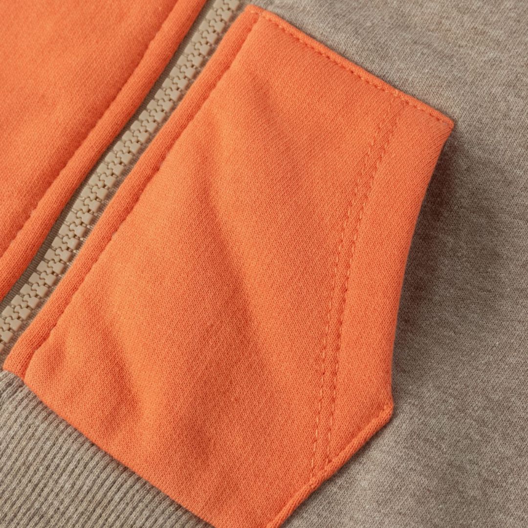 Offener Baby-Sweatshirt für Jungen mit Reißverschluss und Kapuze. Aufgerauter Fleece. Kapuze, Ärmel und Tasche in Kontrastfarbe. Gesticktes Tomatenmotiv auf der Brust.