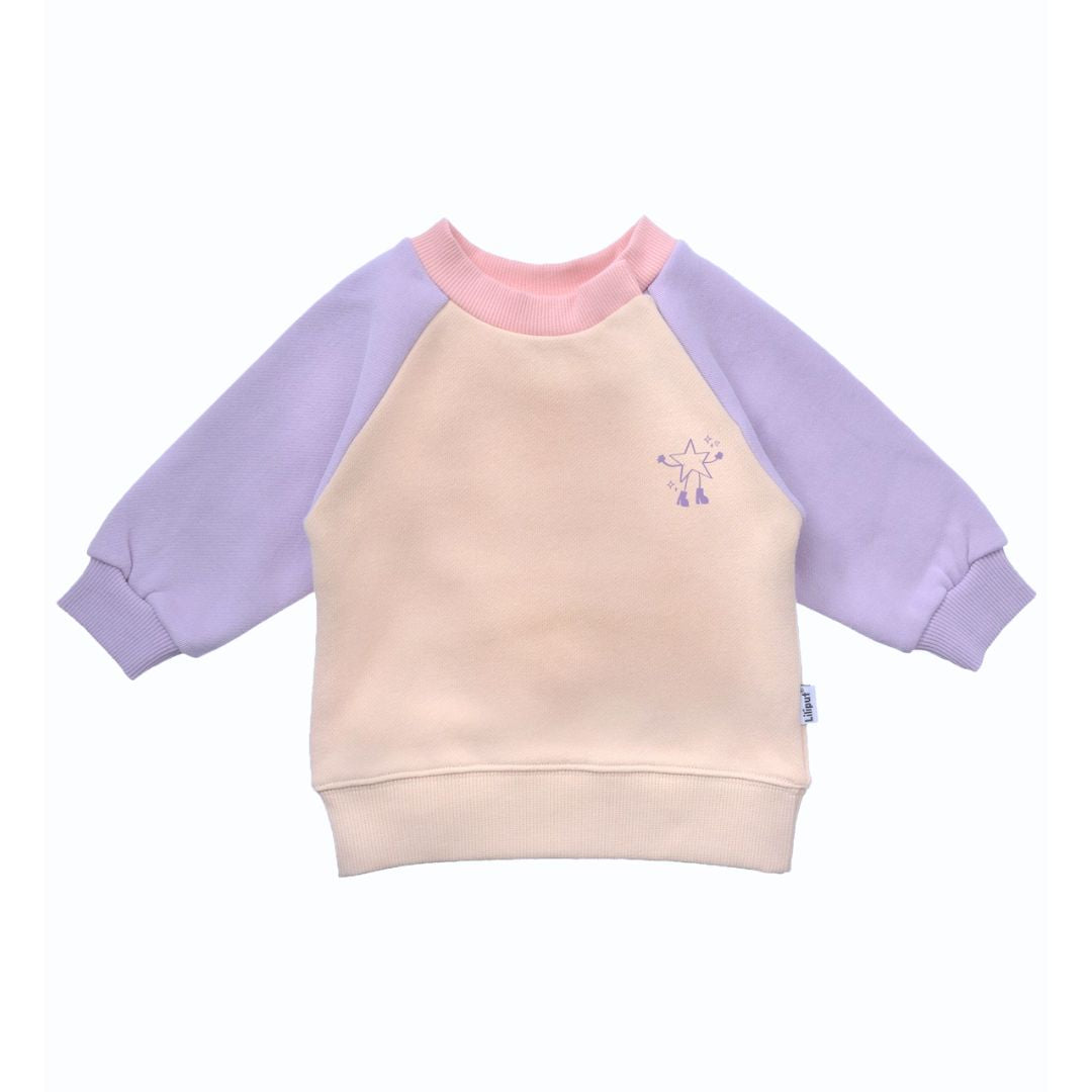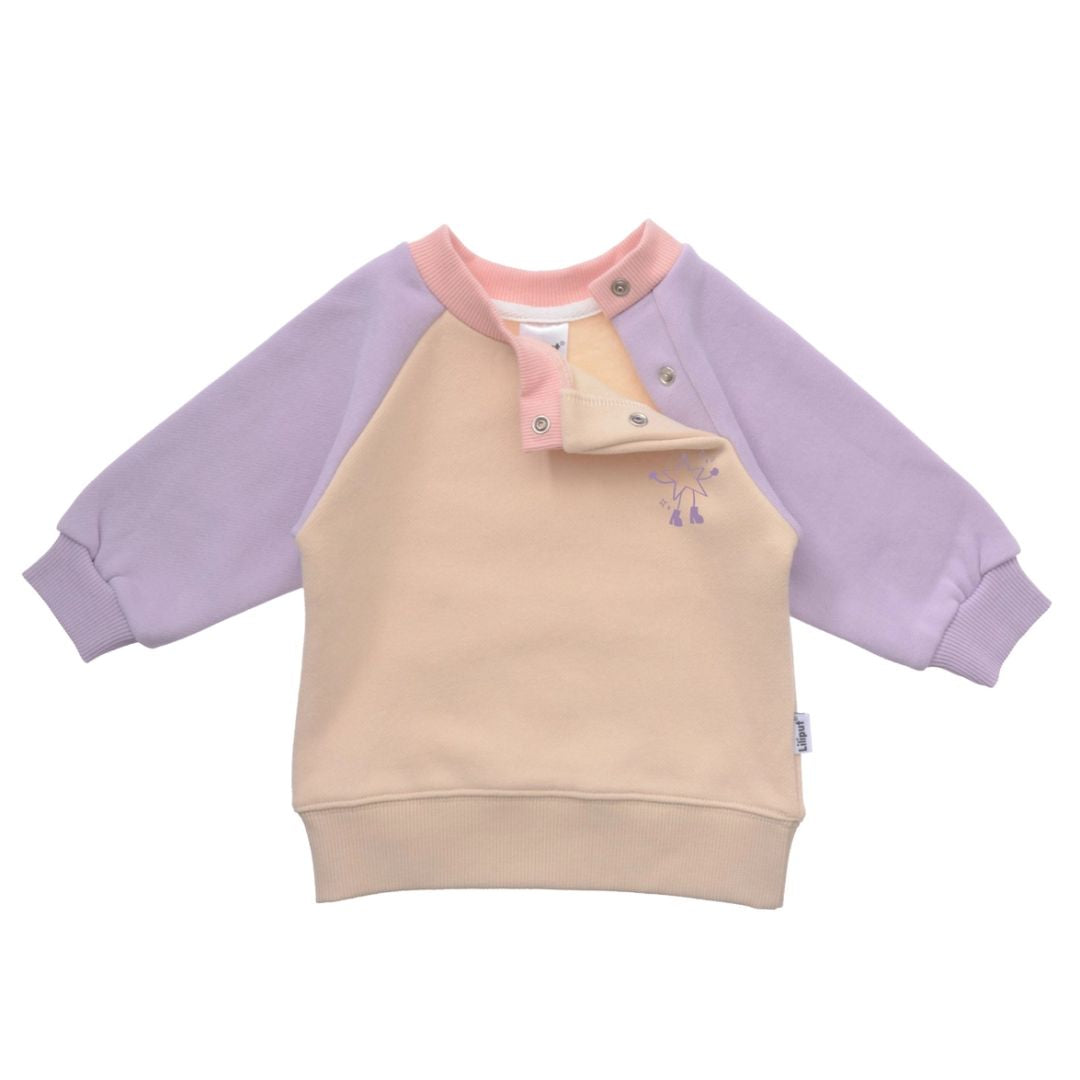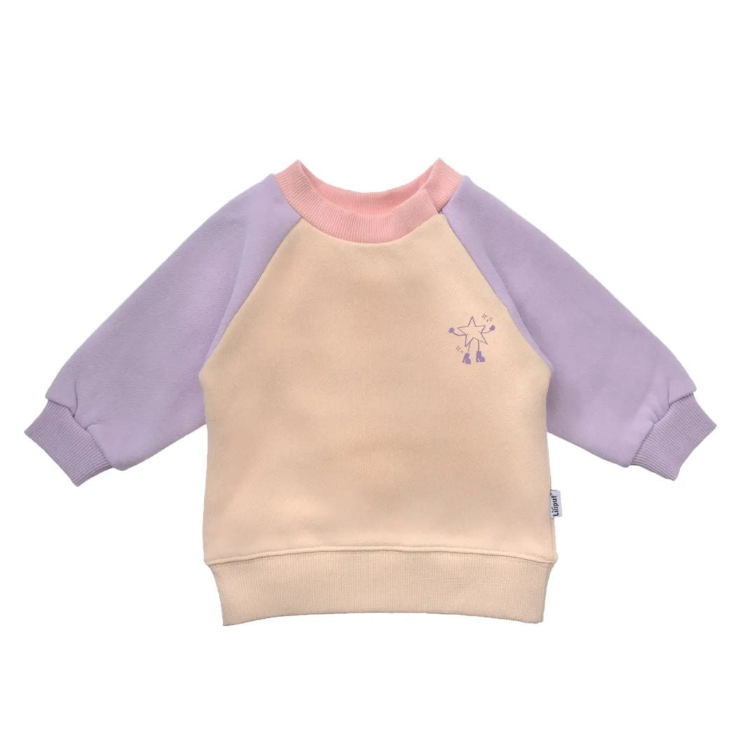 Farbenfrohes Design mit liebevollen Details: fliederfarbene Ärmel, rosa Halsausschnitt, beiger Body, fröhlicher Stern vorne, kleine Discokugel hinten
