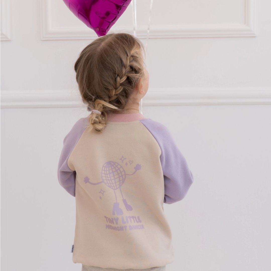 Farbenfroh, freundlich und mit einem liebevollen Augenzwinkern designt: Der multicolor Raglan-Sweater begeistert durch seine harmonische Farbkomposition und kindgerechte Gestaltung. Die fliederfarbenen Ärmel, der rosa Halsausschnitt und der beige Body machen das Tiny Little Midnight Dancer Sweatshirt zu einem echten Blickfang. Doch das wahre Highlight liegt im Detail: Ein fröhlich tanzender Stern auf der Vorderseite und eine kleine glitzernde Discokugel auf der Rückseite, begleitet vom charmanten Wording „tiny little midnight dancer“, machen diesen Pullover zum perfekten Outfit für kleine Nachtschwärmer*innen mit großem Herz und ganz viel Rhythmus im Blut.