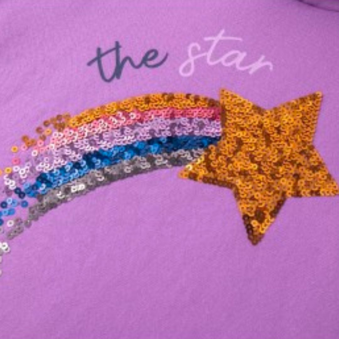 Das modische Sweatshirtkleid ist mehr als nur ein Kleidungsstück – es ist ein Statement der Eleganz, des Komforts und des Glamours. Der witzige Pailletten Shootingstar auf der Vorderseite, garniert mit funkelnden Licht-Effekten, macht dieses Kleid zu einem echten Blickfang.