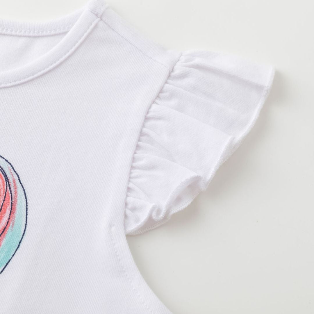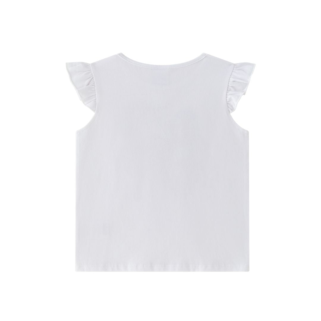 Die gerüschten Träger verleihen dem T-Shirt eine besonders verspielte und feminine Ausstrahlung. Sie machen das Shirt zu einem echten Hingucker und lassen jedes Mädchen wie eine kleine Prinzessin aussehen.