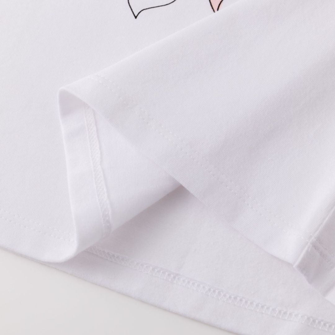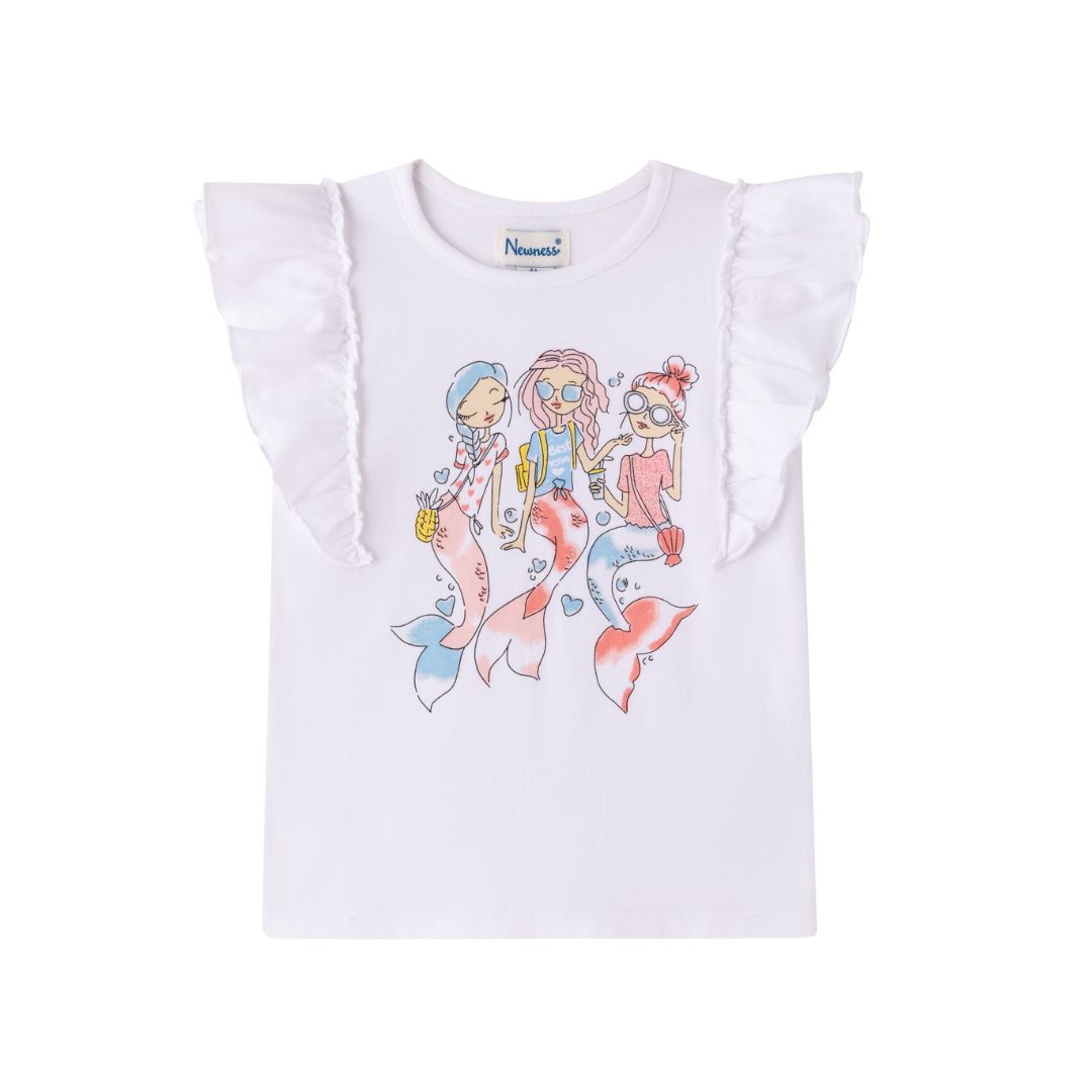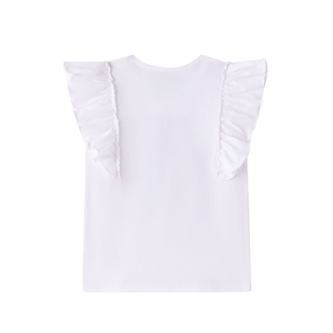 Mädchen-T-Shirt aus Single-Jersey, mit Rüschen an den Seiten. Wasserdruck in der Mitte des Kleidungsstücks.