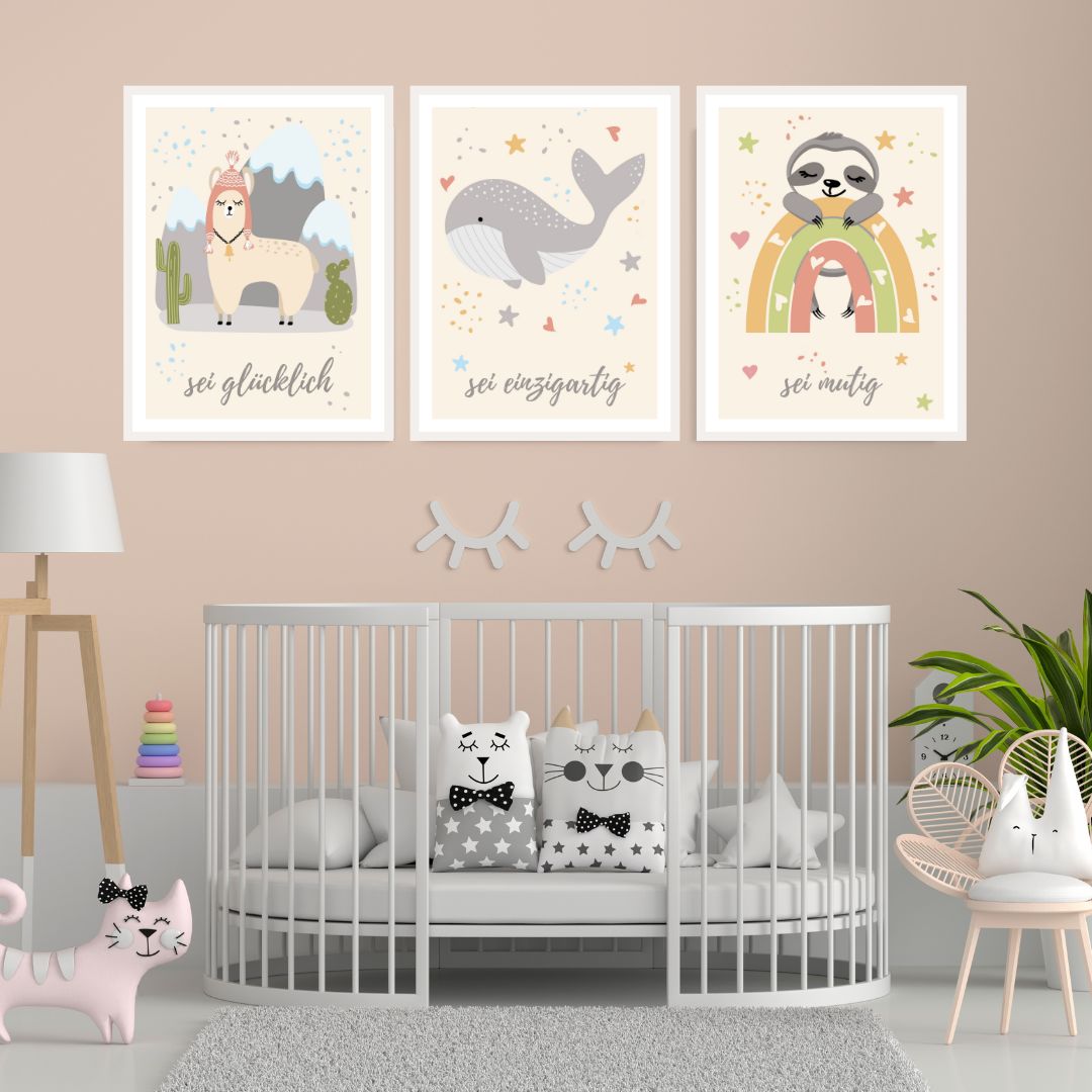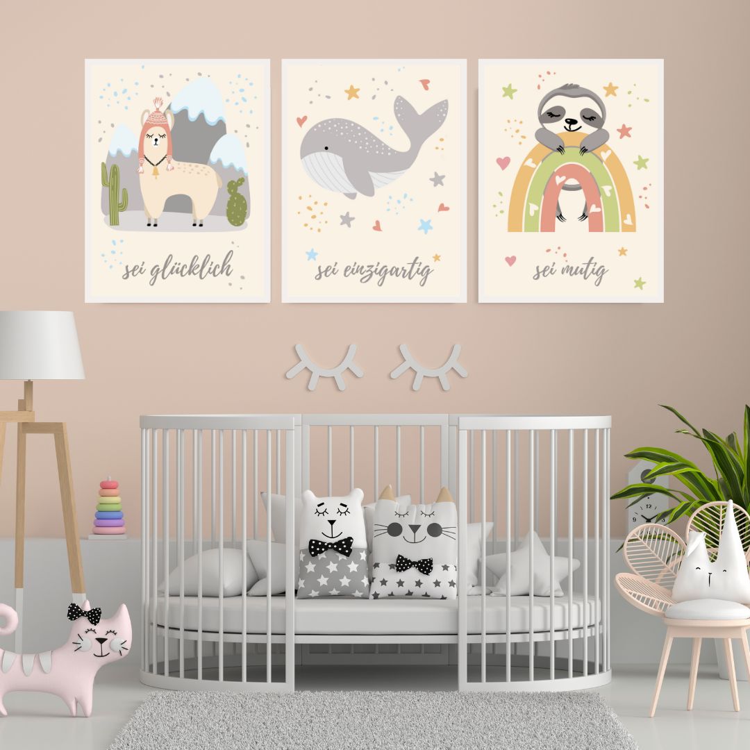 Glückssätze stärken Kinder und helfen ihnen glücklich zu sein und sich von nichts unterkriegen zu lassen. Dieses zauberhafte 3er Set Wandbilder fürs Babyzimmer oder Kinderzimmer mit kleinen Motivationssprüchen schafft eine liebevolle Umgebung für Deinen kleinen Süßling und versprüht durch die 3 zusammengehörenden Bilder jede Menge Harmonie und Geborgenheit. Es ist ein wirkungsvoller Blickfang und eine einfache Methode die Wände aufzupeppen.