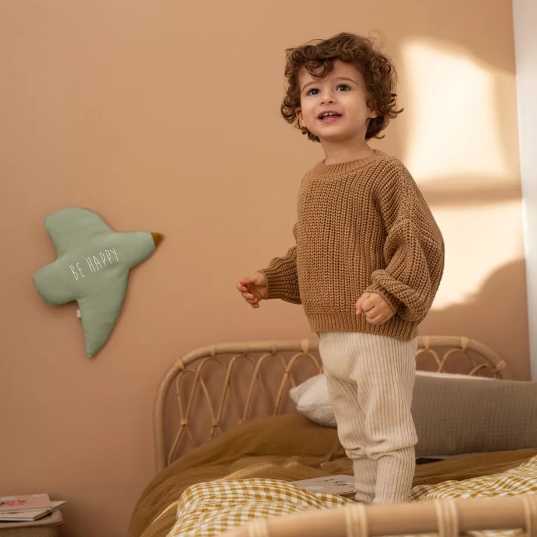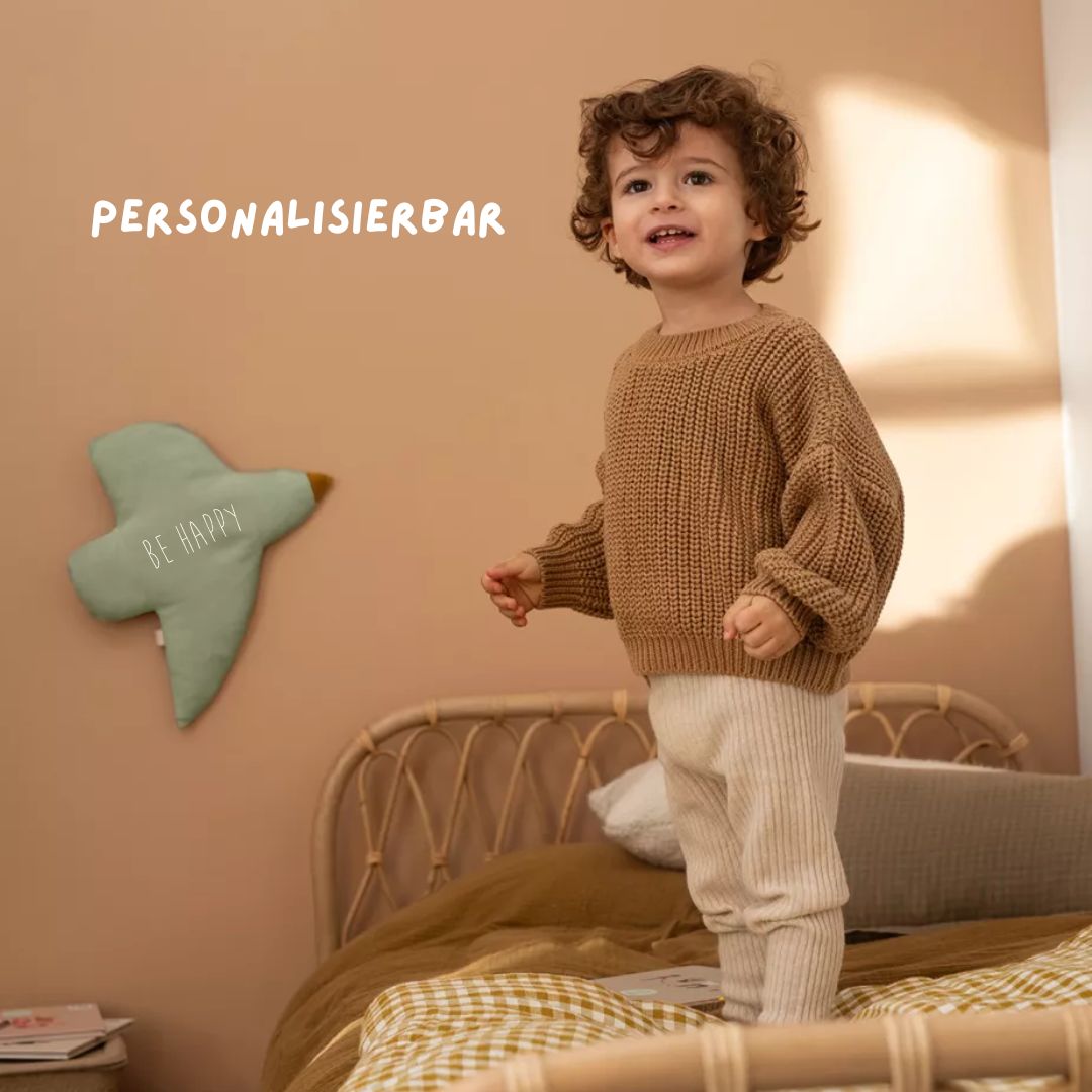Wie die meisten unserer Produkte ist auch der grüne Vogel maschinenwaschbar. Entferne vor dem Waschen einfach das Polsterkissen, drehe den Bezug auf links und wasche ihn bei 30 Grad im Kurzprogramm. Für personalisierte Produkte empfehlen wir, auf der Rückseite zu bügeln. So bleibt die Gravur erhalten und dein Dekostück sieht lange wie neu aus. Auch wenn dein Kind mit dem Vogel spielt oder ihn neugierig entdeckt – keine Sorge: Die Reinigung ist kinderleicht.