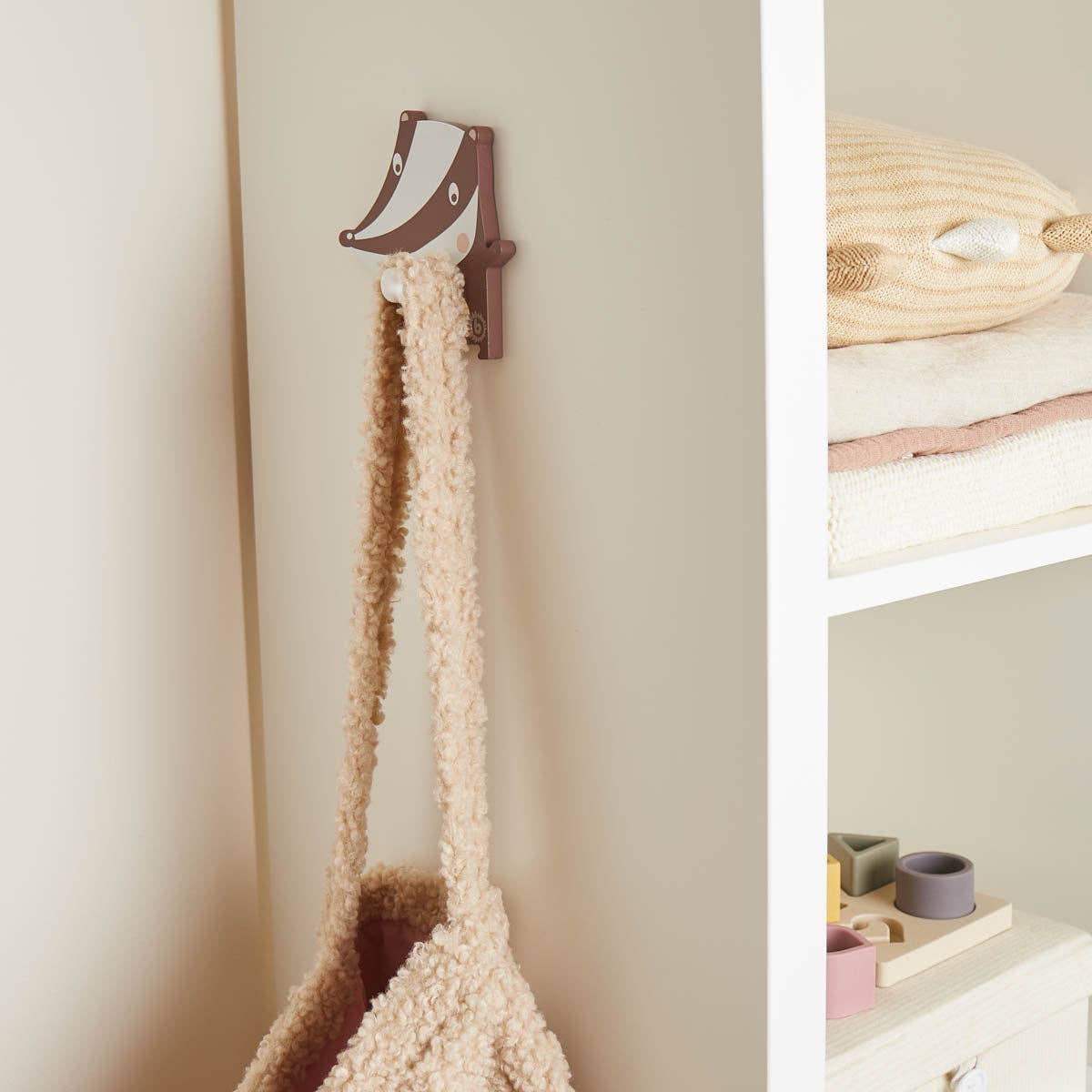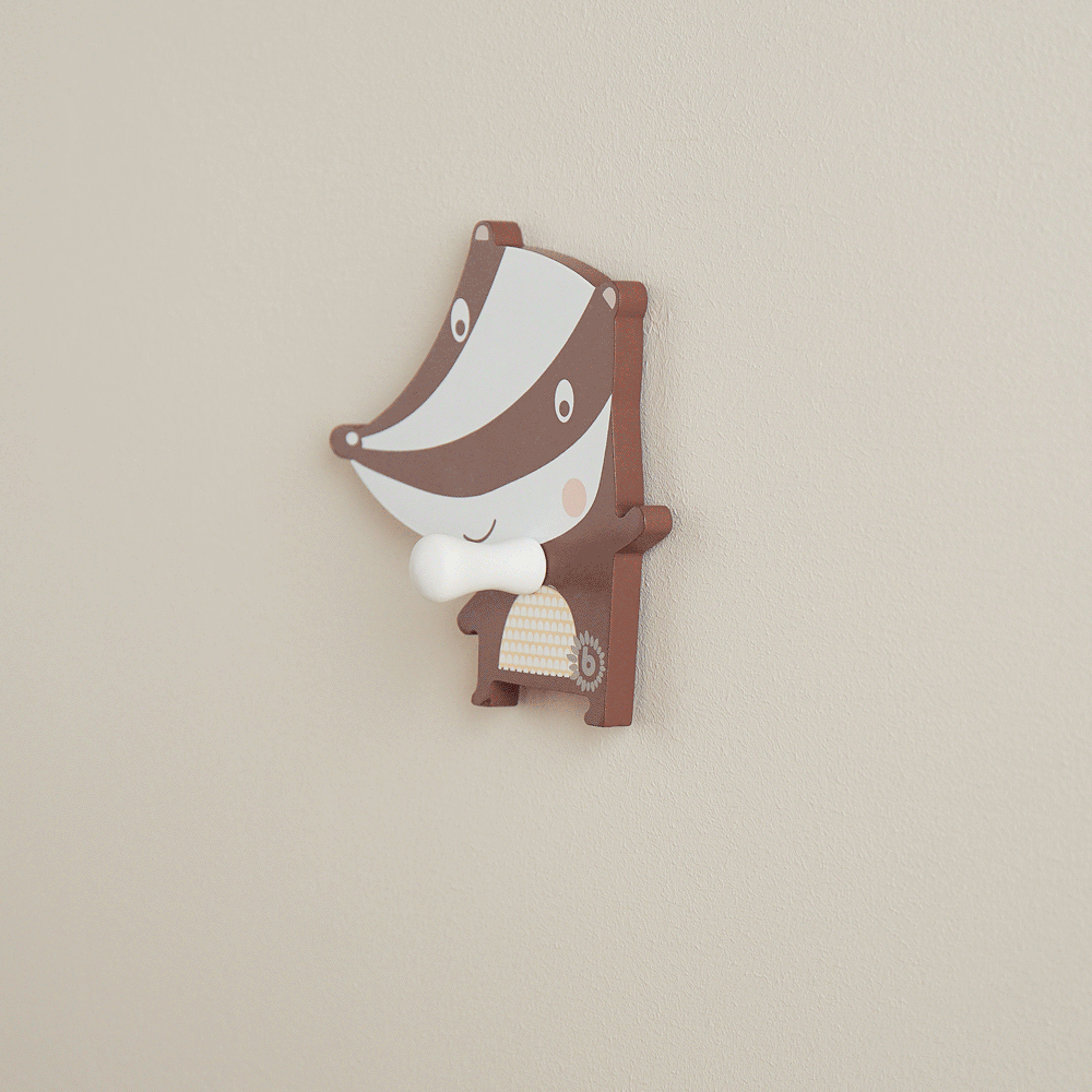 WANDHAKEN DACHS Im Kinderzimmer, im Flur oder bei Oma & Opa; mit diesem schönen Garderobenhaken von Bieco wird Dein Kind gern Ordnung halten. Die kleinen Wandhaken sind ein Hingucker und praktisch zugleich. Der robuste Haken im Dachs Motiv ist aus Holz gefertigt und bewacht Jacken, Rücksäcke & Co. Eine praktische Metallaufhängung hält den Haken an Ort und Stelle und macht die Montage leicht. Wähle oder kombiniere zwischen den vier Motiven: Dachs, Hase, Panda und Bär, für eine dekorative Wand und ein aufgeräumtes Zimmer. Entdecke auch unsere passenden Wandgarderoben. DETAILS * Farbe: chocolate Mix * Material: Holz (MDF), Farben auf Wasserbasis * Größe: 12,5 x 12 x 4 cm * Paketinhalt: 1 Garderobenhaken PFLEGEHINWEISE * Mit einem feuchten Tuch und milder Seife reinigen. Nicht in Wasser tauchen. Lufttrocken. PRODUKTSICHERHEIT * Unabhängig getestet und auf Schadstoffe geprüft.