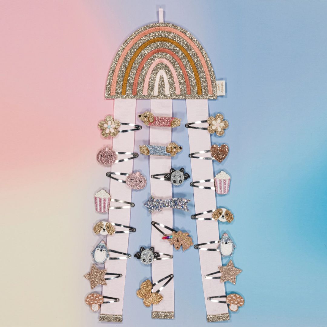 Ein funkelnder Regenbogen, um all deine hübschen Haarspangen aufzubewahren. Zwischen Traum und Sanftheit bringt er eine magische Note ins Zimmer.